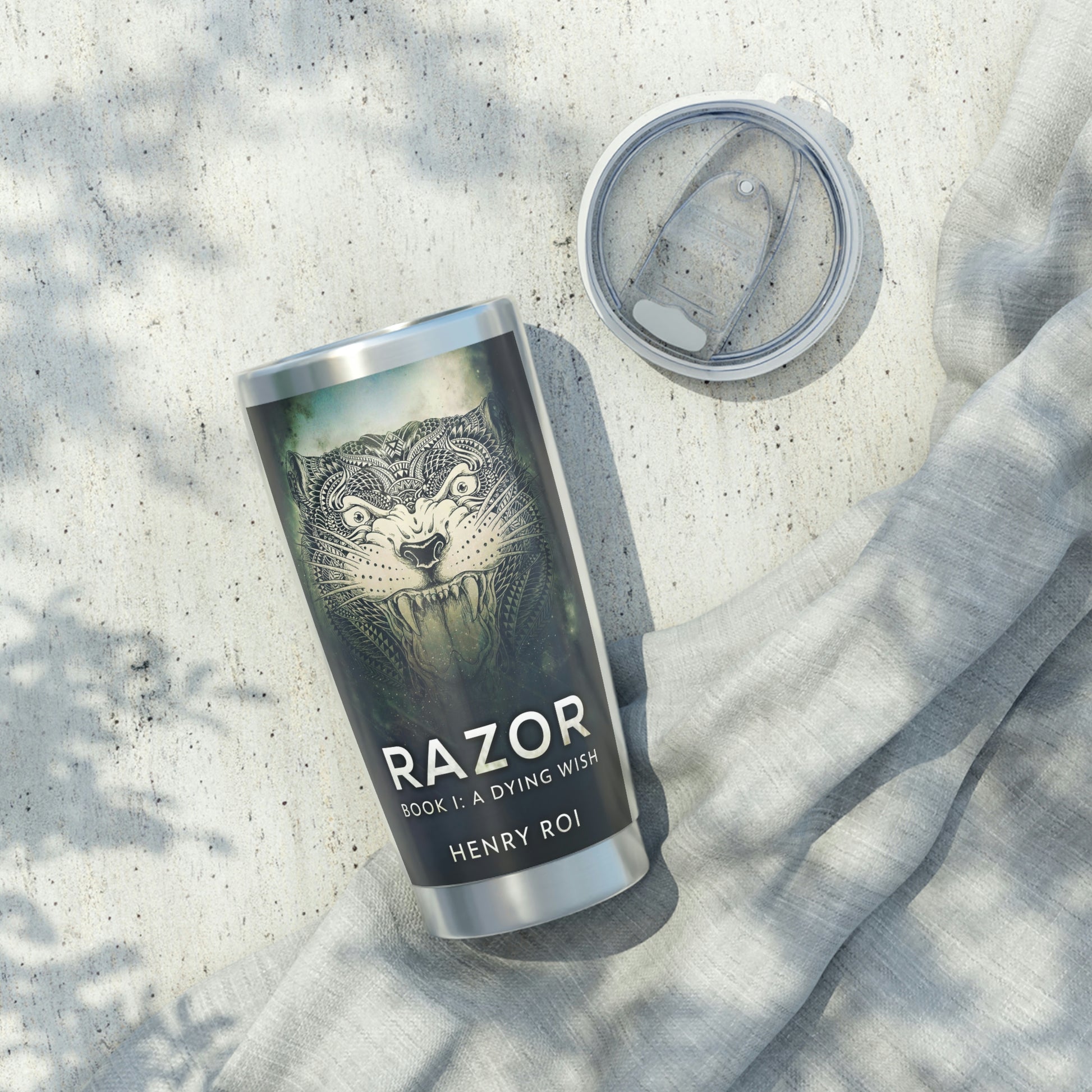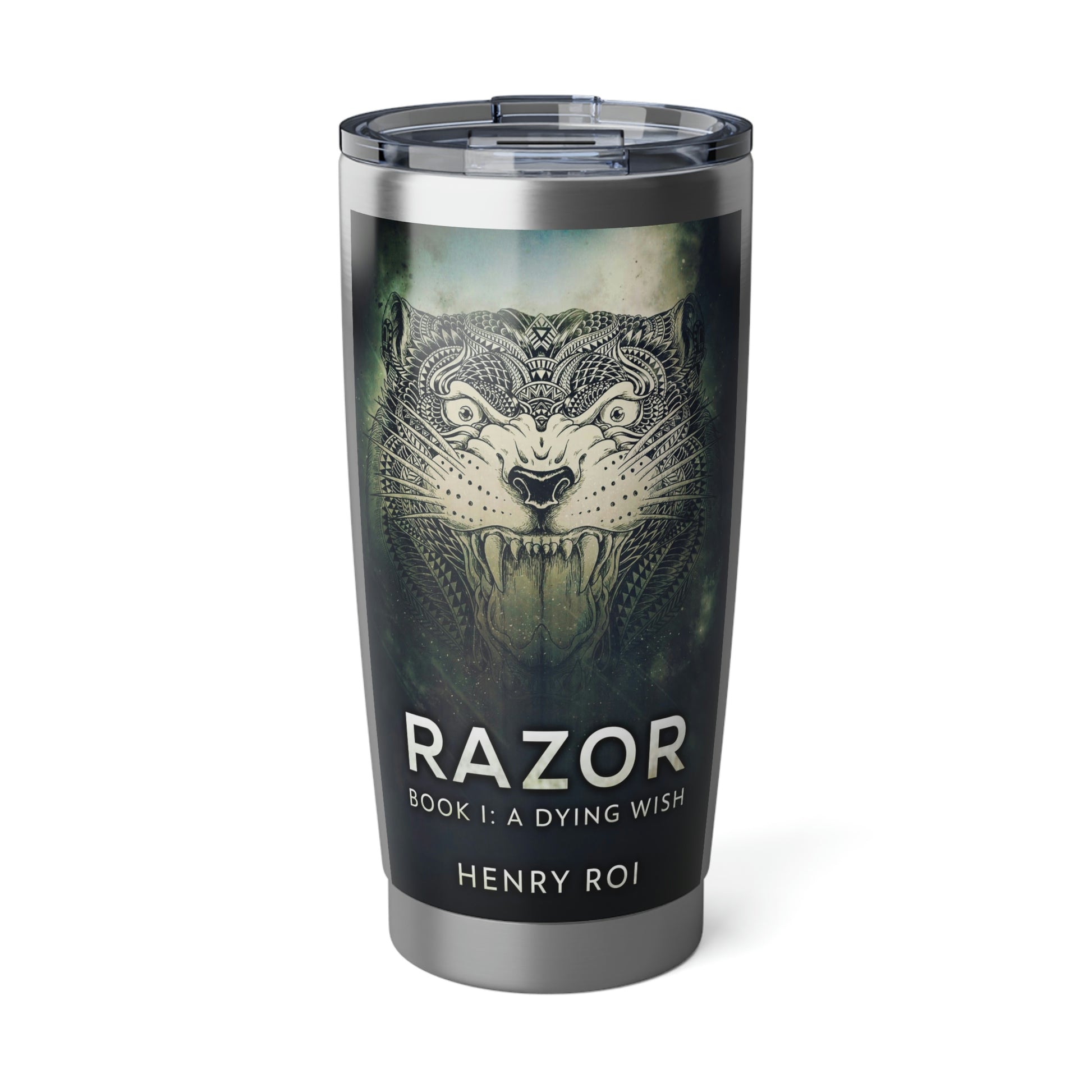 Minimize your plastic footprint with style. This tumbler fits perfectly into car cup holders, and the rubber gasket makes it spill-resistant on bumpier roads. The double-wall insulation makes sure drinks stay at the right temperature until the next pit stop. The cover art in this 20 oz tumbler is from Henry Roi's book, A Dying Wish.