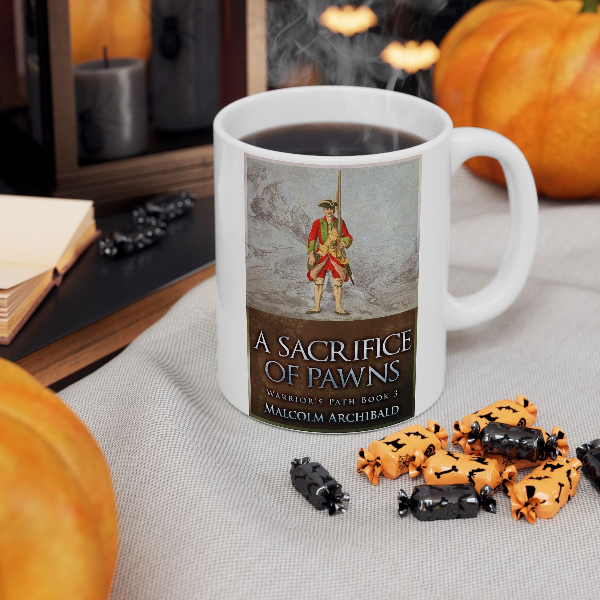 Warm your soul with a nice cuppa out of this perfectly sized white ceramic mug. It’s BPA and lead-free, microwave and dishwasher-safe, and made of durable ceramic. The cover art in this coffee mug is from Malcolm Archibald's book, A Sacrifice of Pawns.