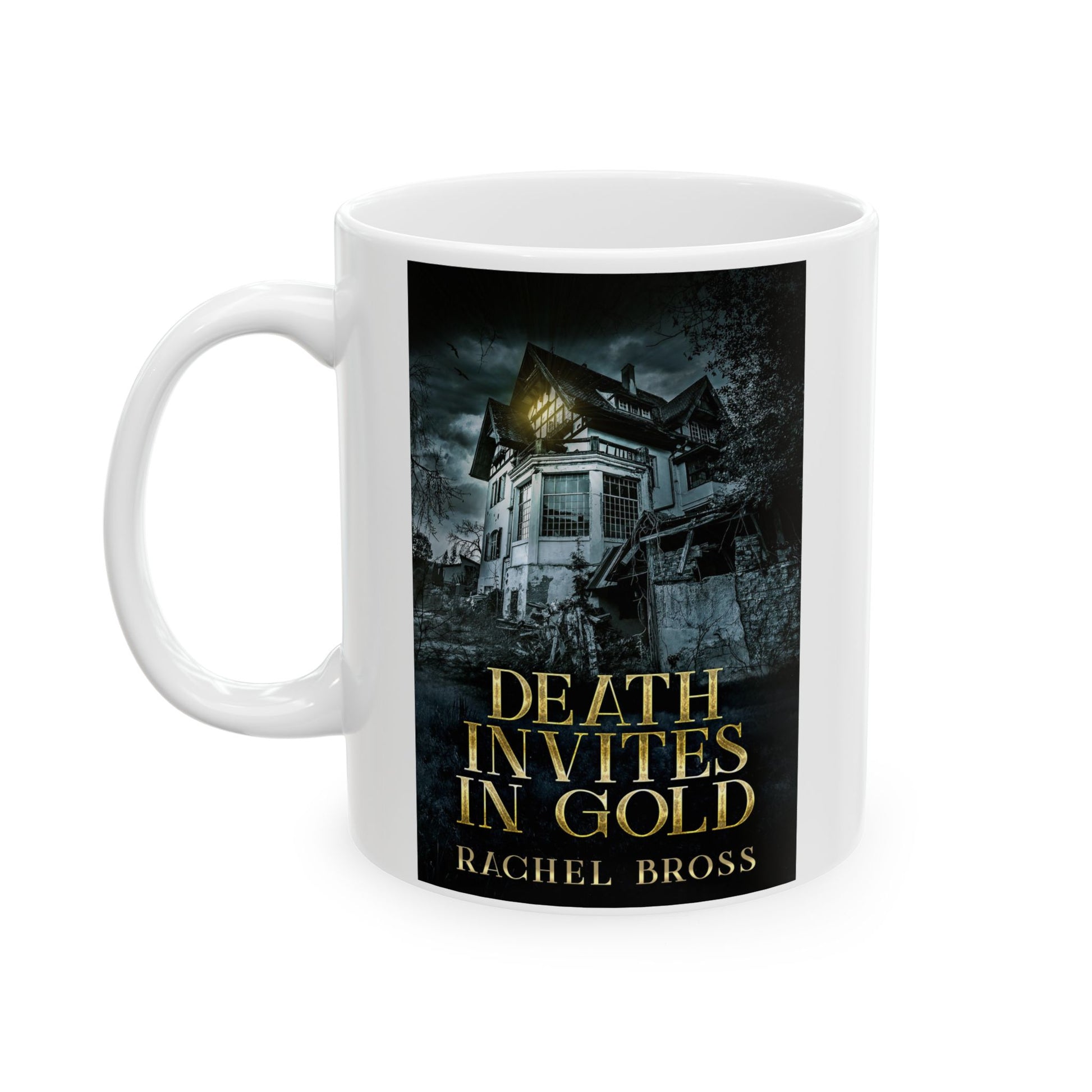 Warm your soul with a nice cuppa out of this perfectly sized white ceramic mug. It’s BPA and lead-free, microwave and dishwasher-safe, and made of durable ceramic. The cover art in this coffee mug is from Rachel Bross's book, Death Invites In Gold.