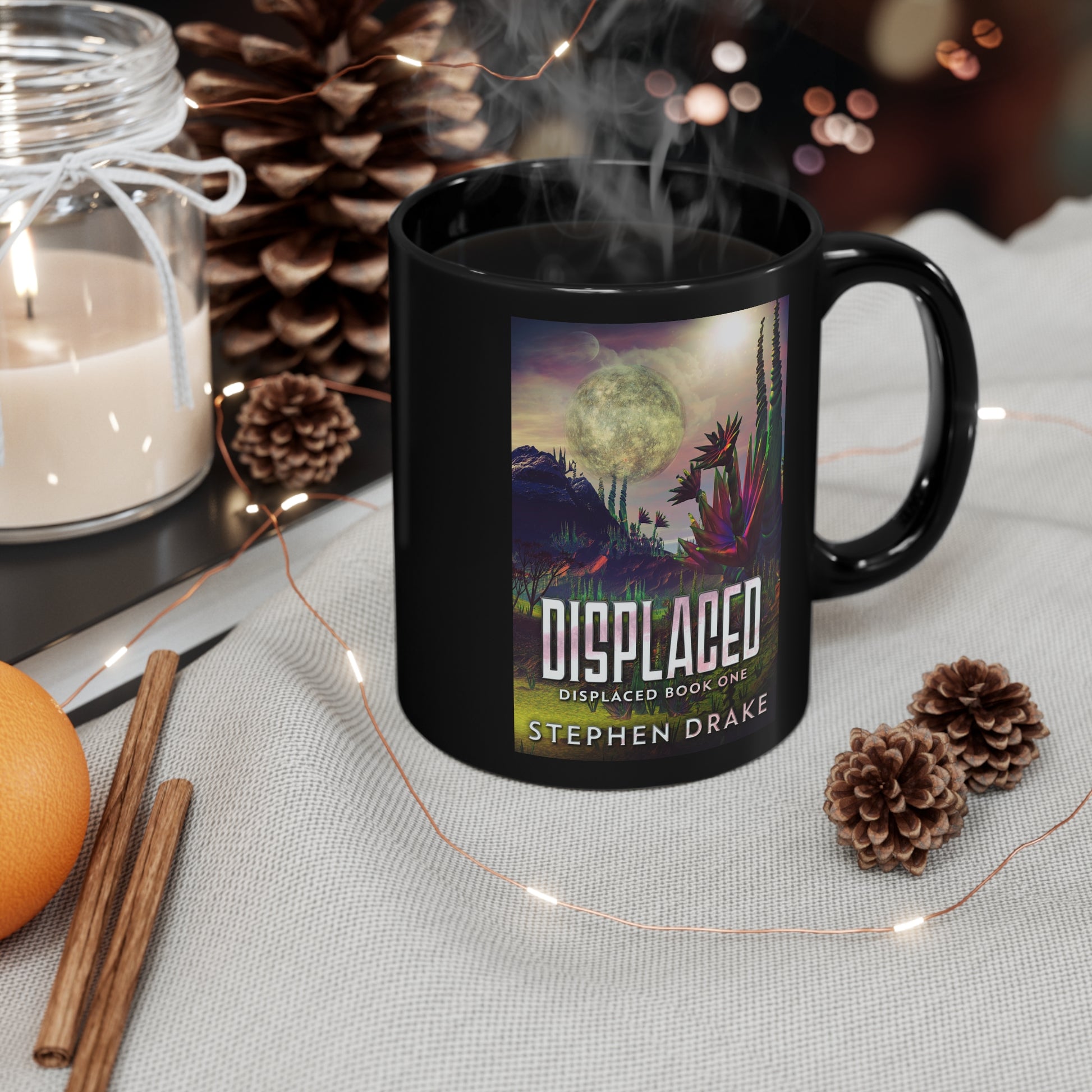 Warm your soul with a nice cuppa out of this perfectly sized black ceramic mug. It’s BPA and lead-free, microwave and dishwasher-safe, and made of black durable ceramic. The cover art in this coffee mug is from Stephen Drake's book, Displaced (Displaced Book 1).