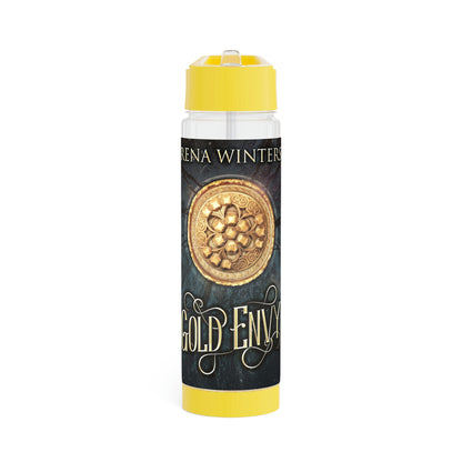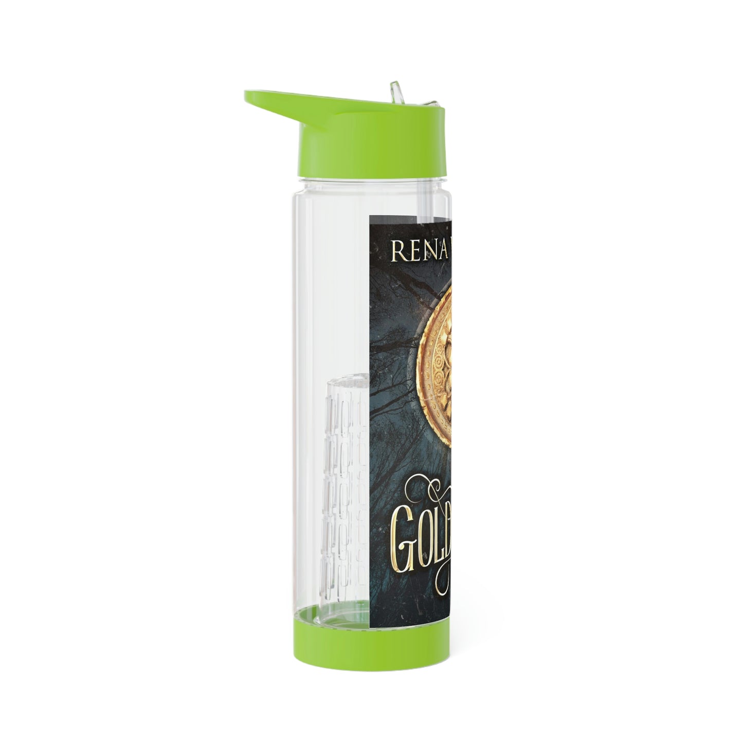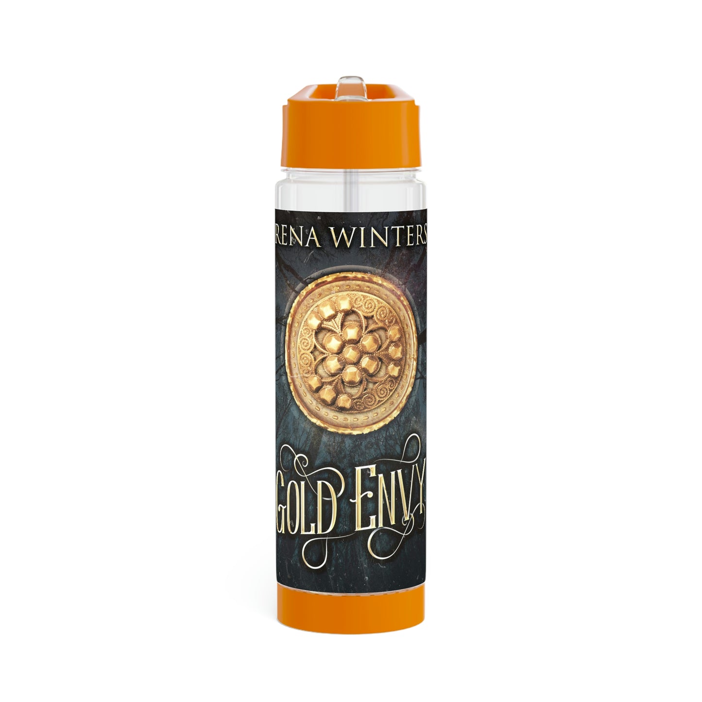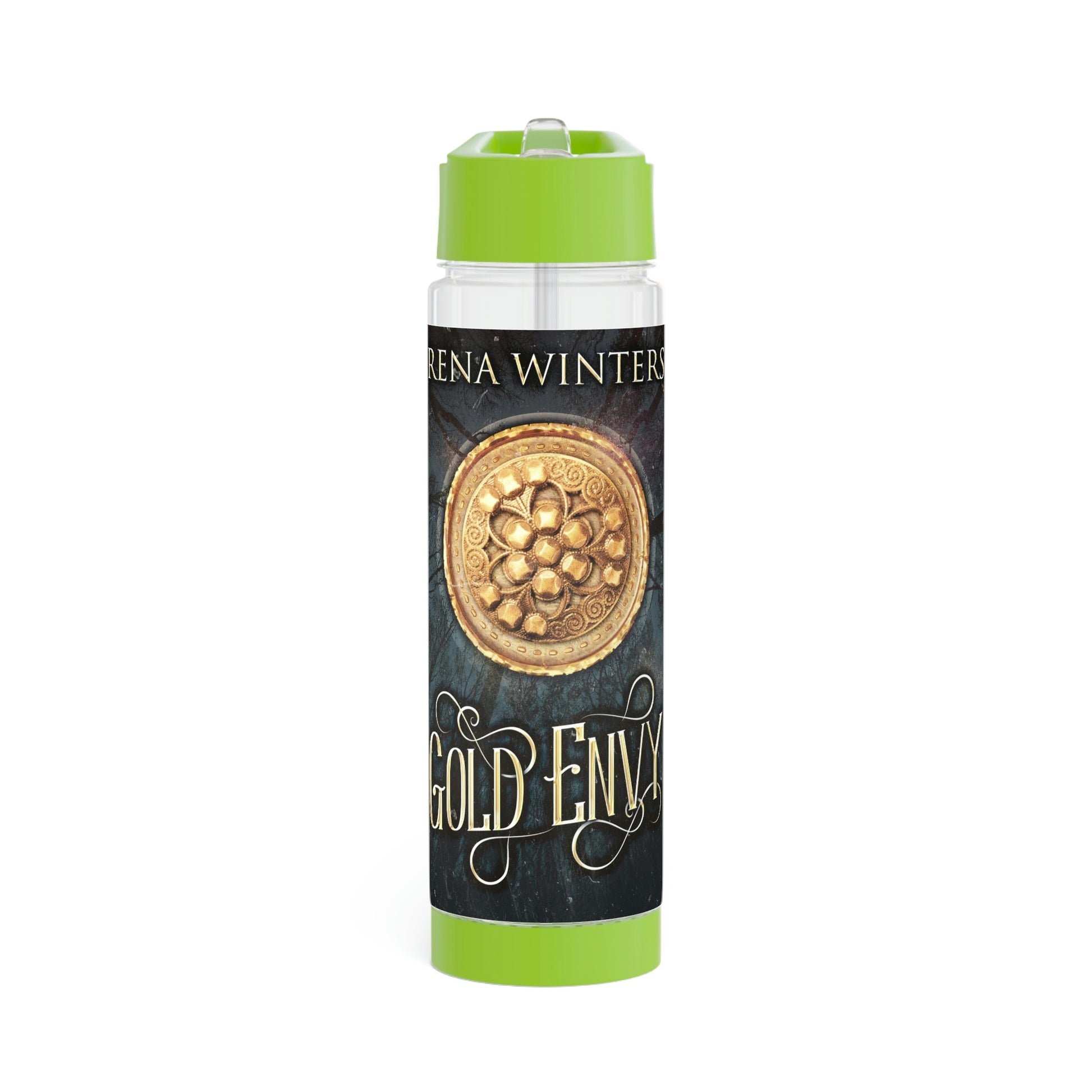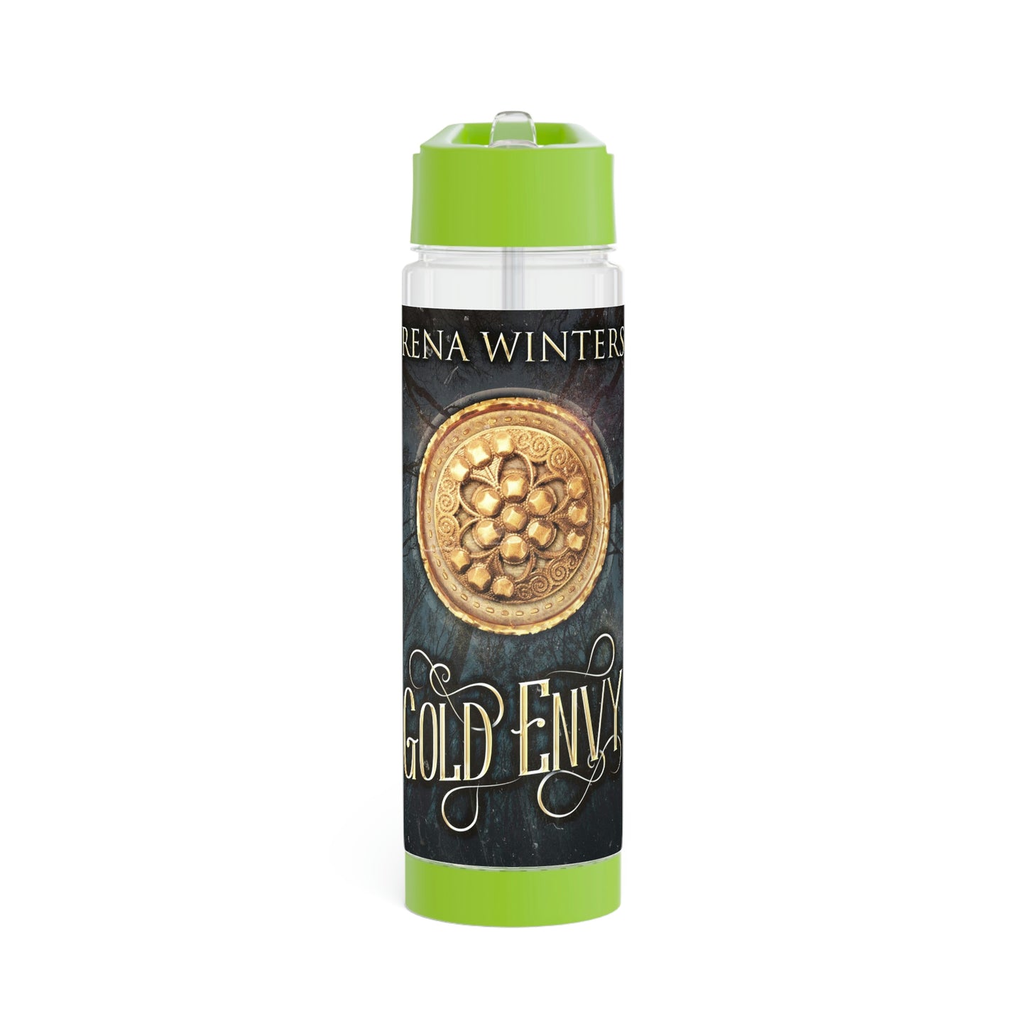 Add flavor and personality to your water with this infuser bottle. Twist the base off to access the infuser and add fruits, tea leaves, or anything you desire to enhance the flavor of your water. On the top, you'll find a twist-on lid with a flip-top drinking sprout for a seamless drinking experience. This infuser is excellent for using at home, during outdoor excursions, or at the gym as a sports bottle. The cover art in this infuser water bottle is from Rena Winters's book, Gold Envy.