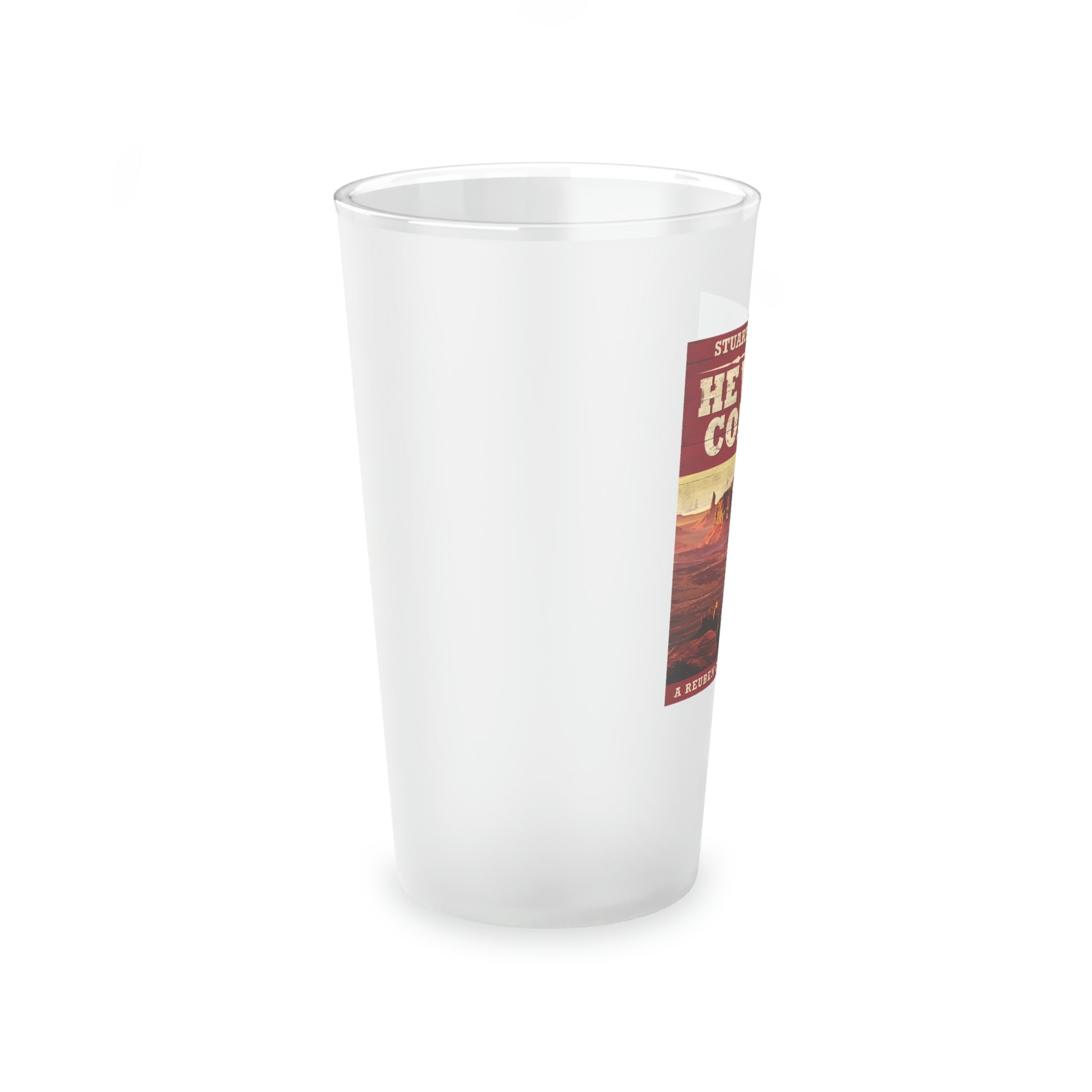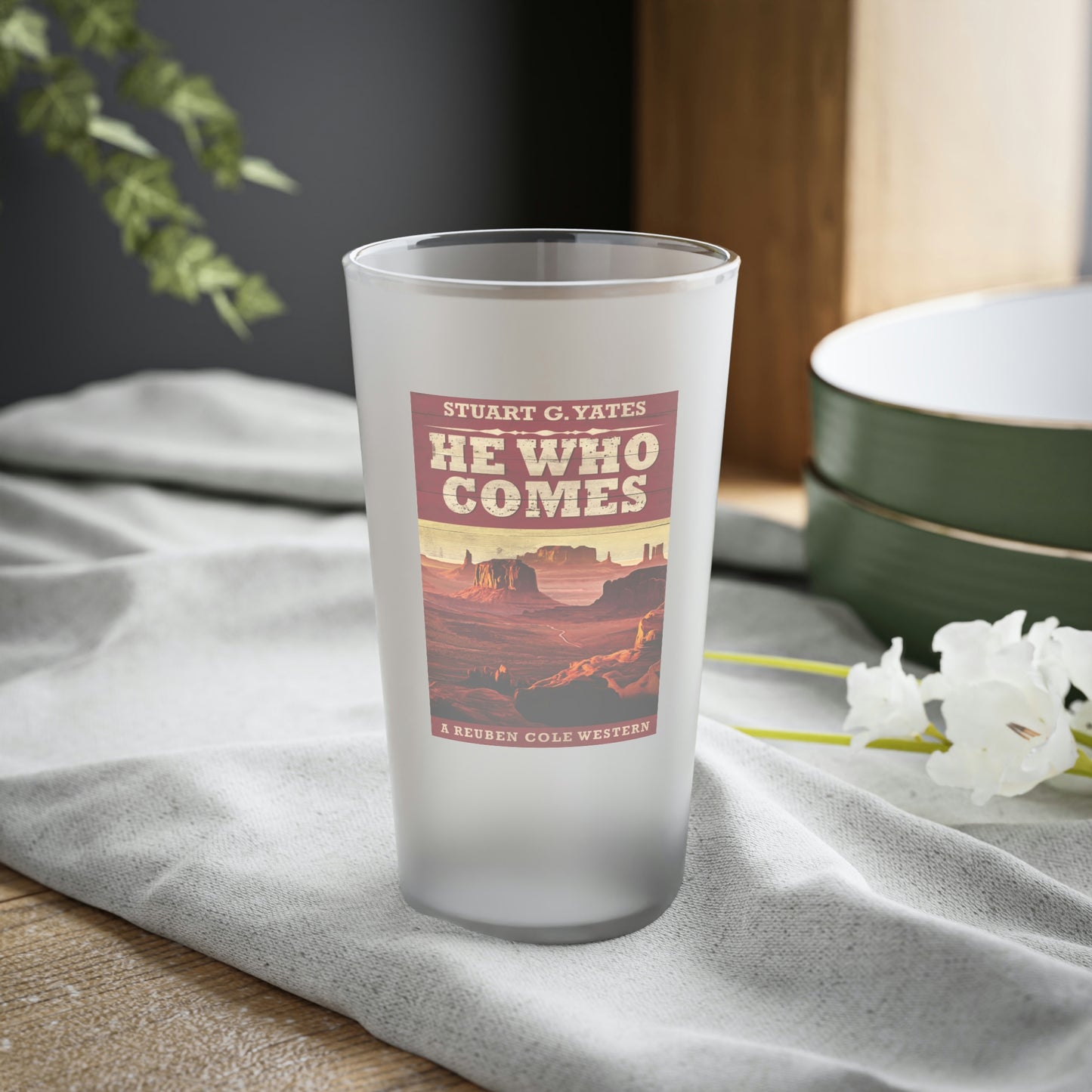 This frosted matte finish pint glass is versatile and dishwasher-safe. The cover art in this pint glass is from Stuart G. Yates's book, He Who Comes.