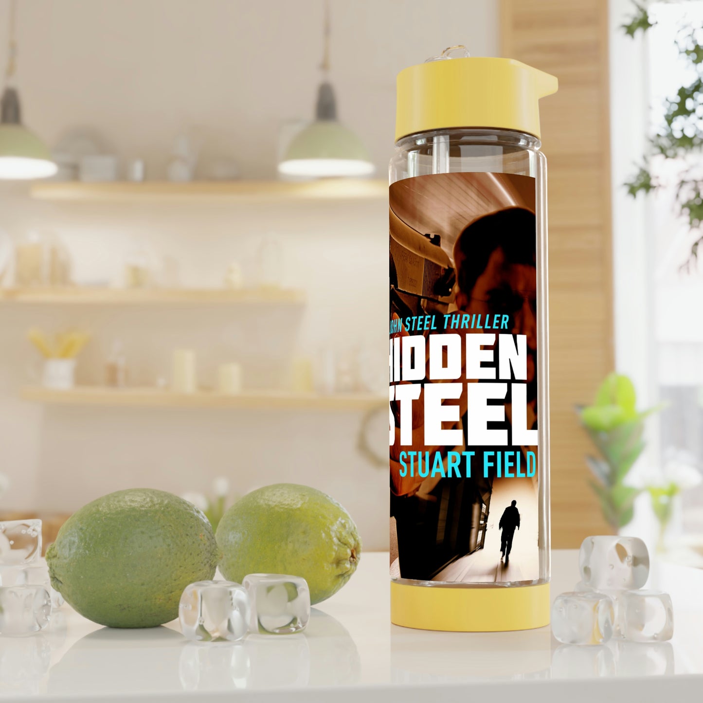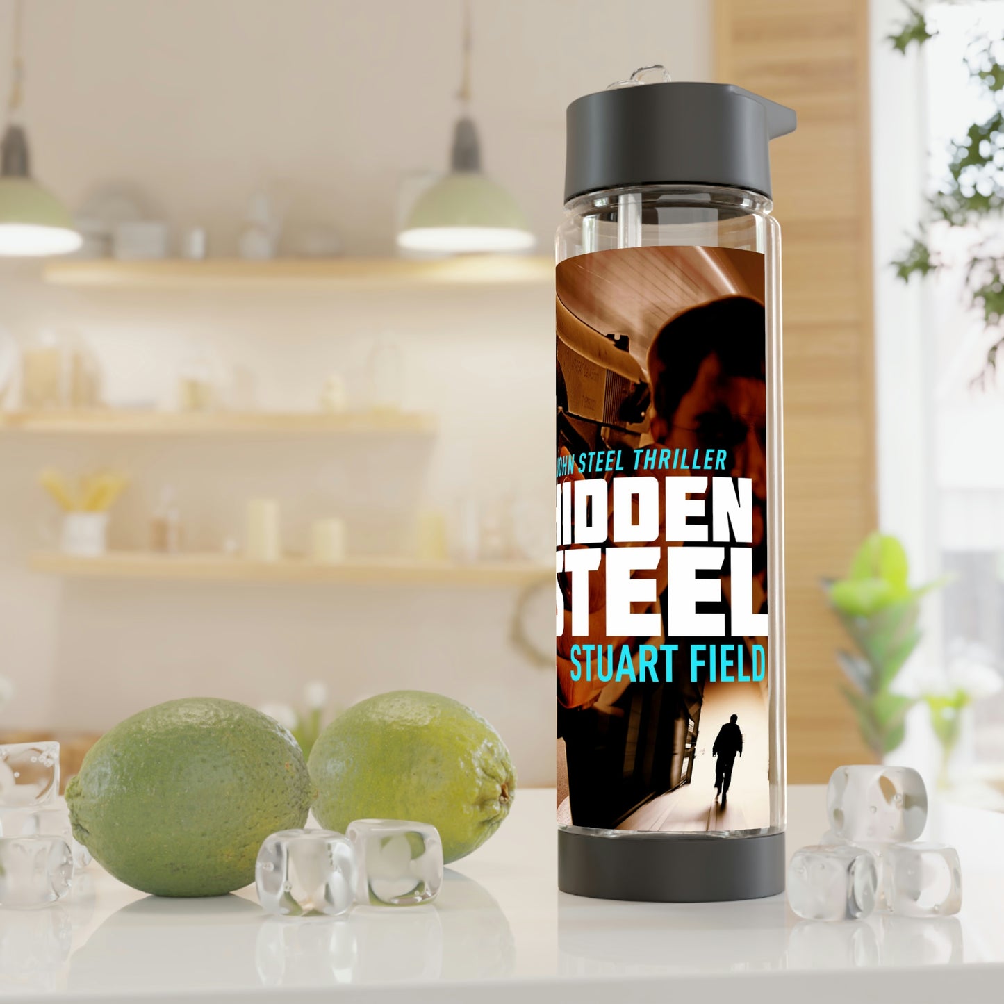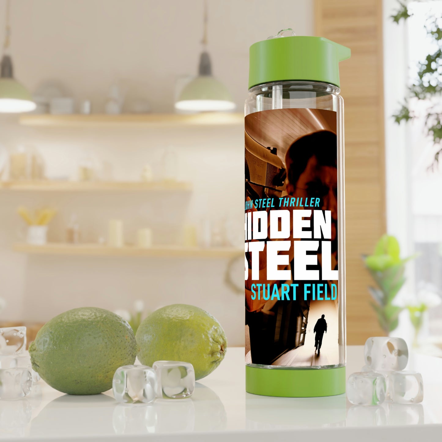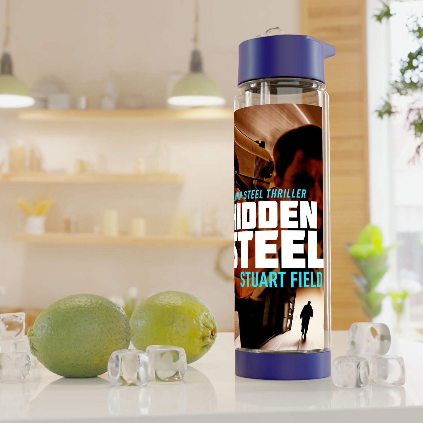 Add flavor and personality to your water with this infuser bottle. Twist the base off to access the infuser and add fruits, tea leaves, or anything you desire to enhance the flavor of your water. On the top, you'll find a twist-on lid with a flip-top drinking sprout for a seamless drinking experience. This infuser is excellent for using at home, during outdoor excursions, or at the gym as a sports bottle. The cover art in this infuser water bottle is from Stuart Field's book, Hidden Steel.