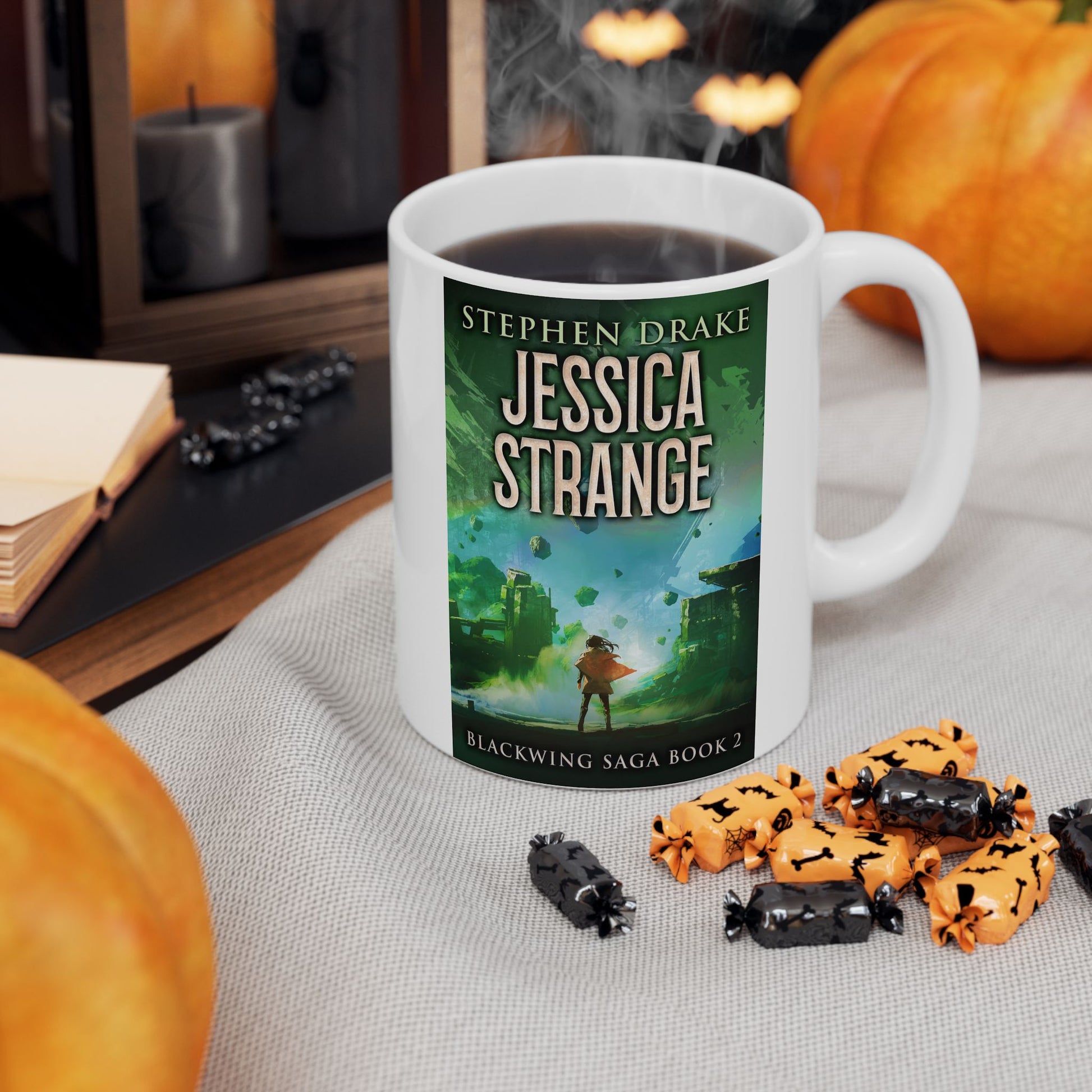 Warm your soul with a nice cuppa out of this perfectly sized white ceramic mug. It’s BPA and lead-free, microwave and dishwasher-safe, and made of durable ceramic. The cover art in this coffee mug is from Stephen Drake's book, Jessica Strange.