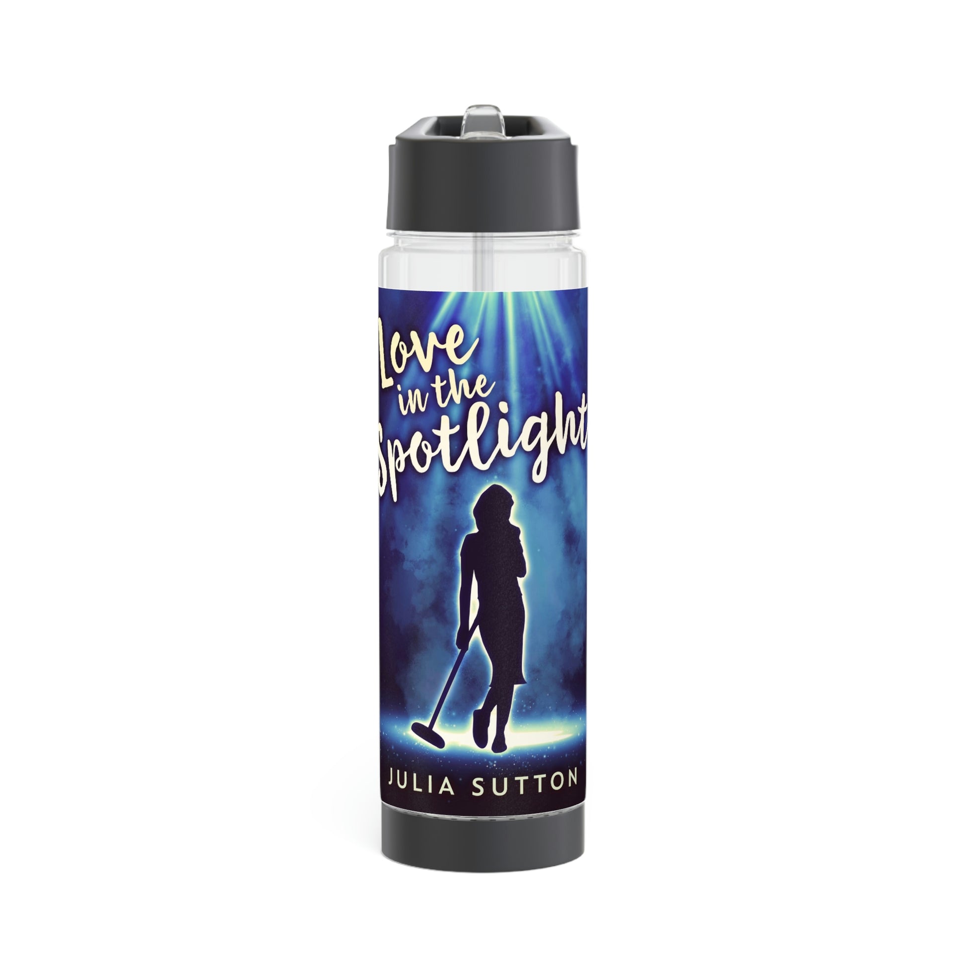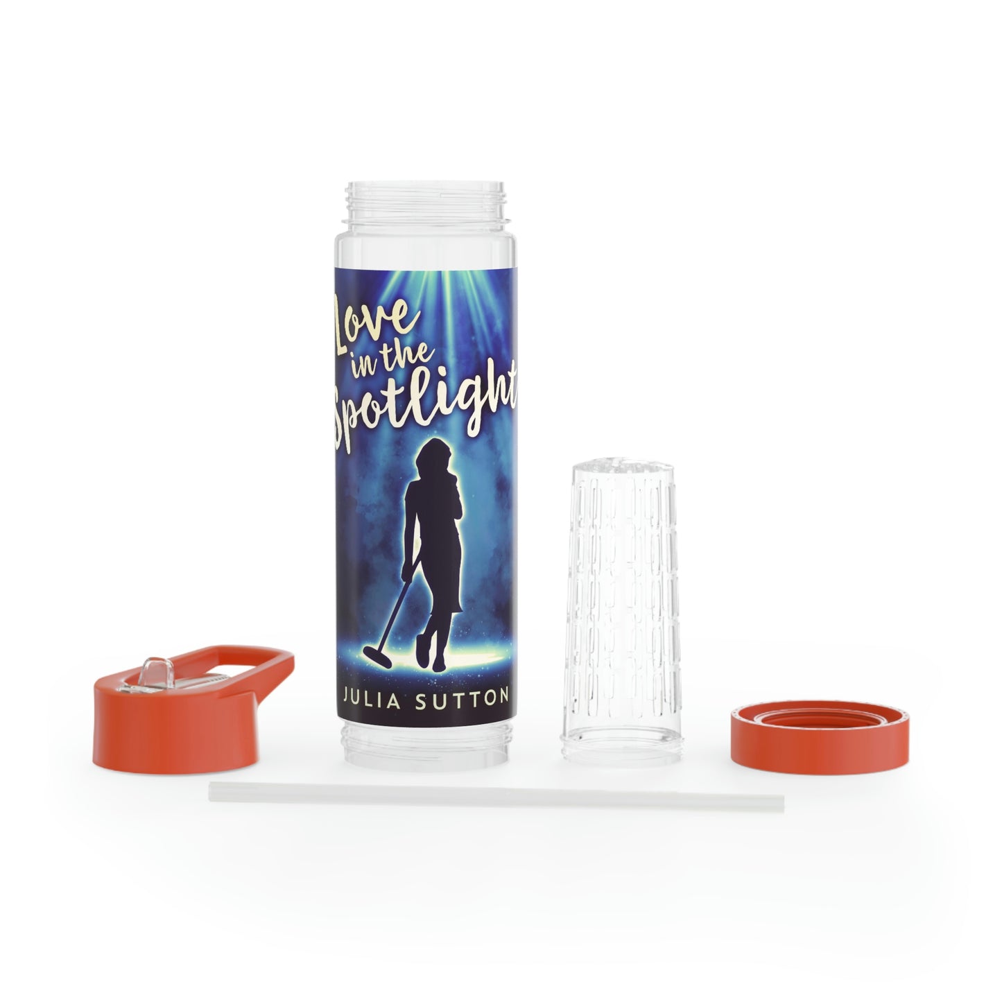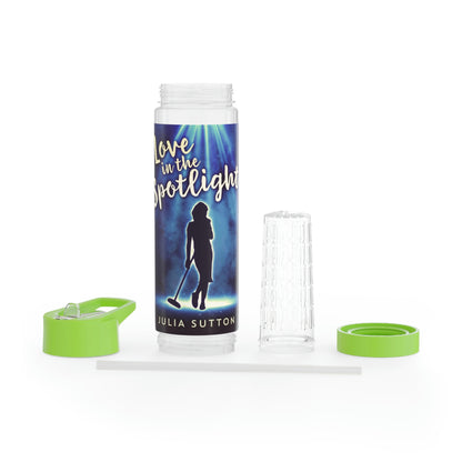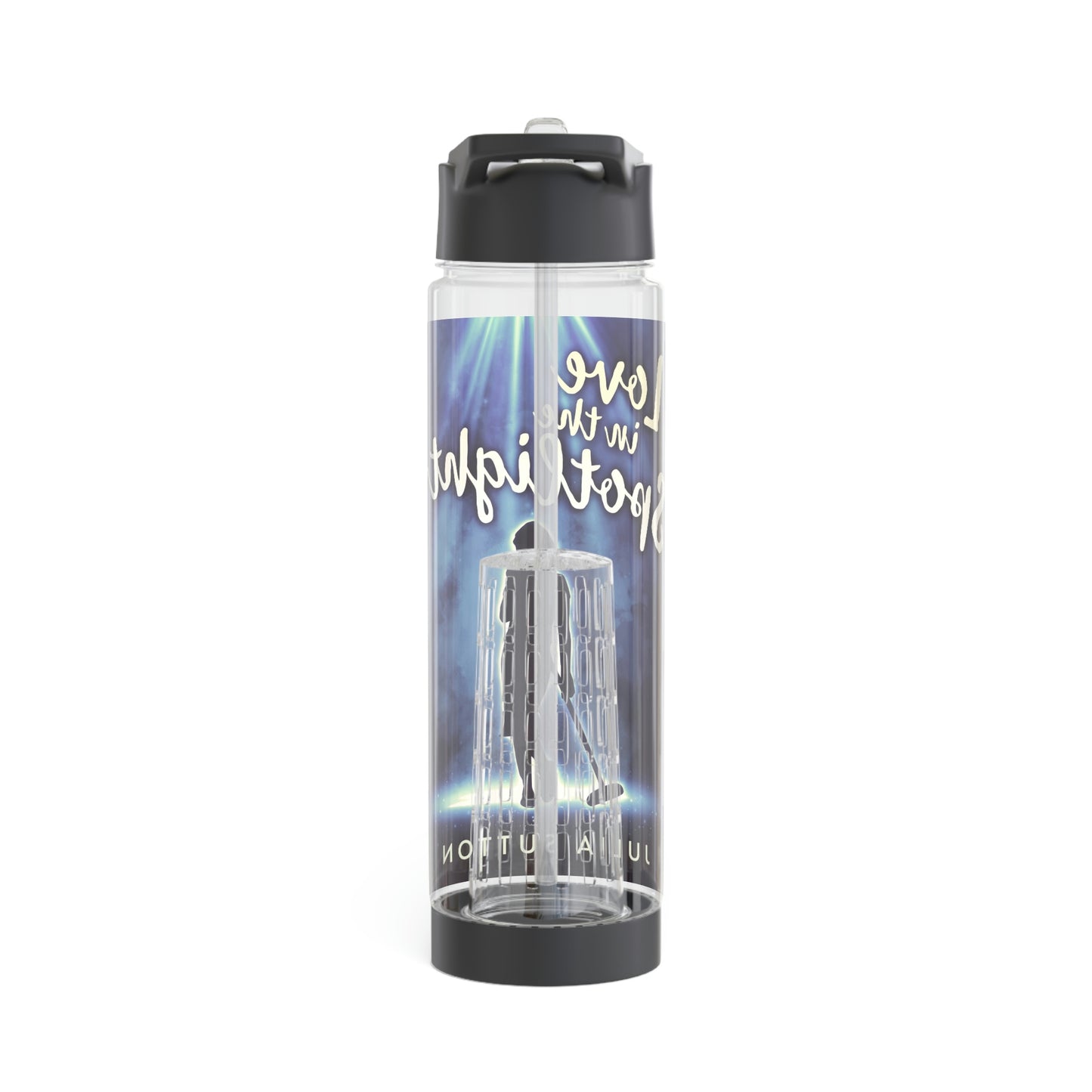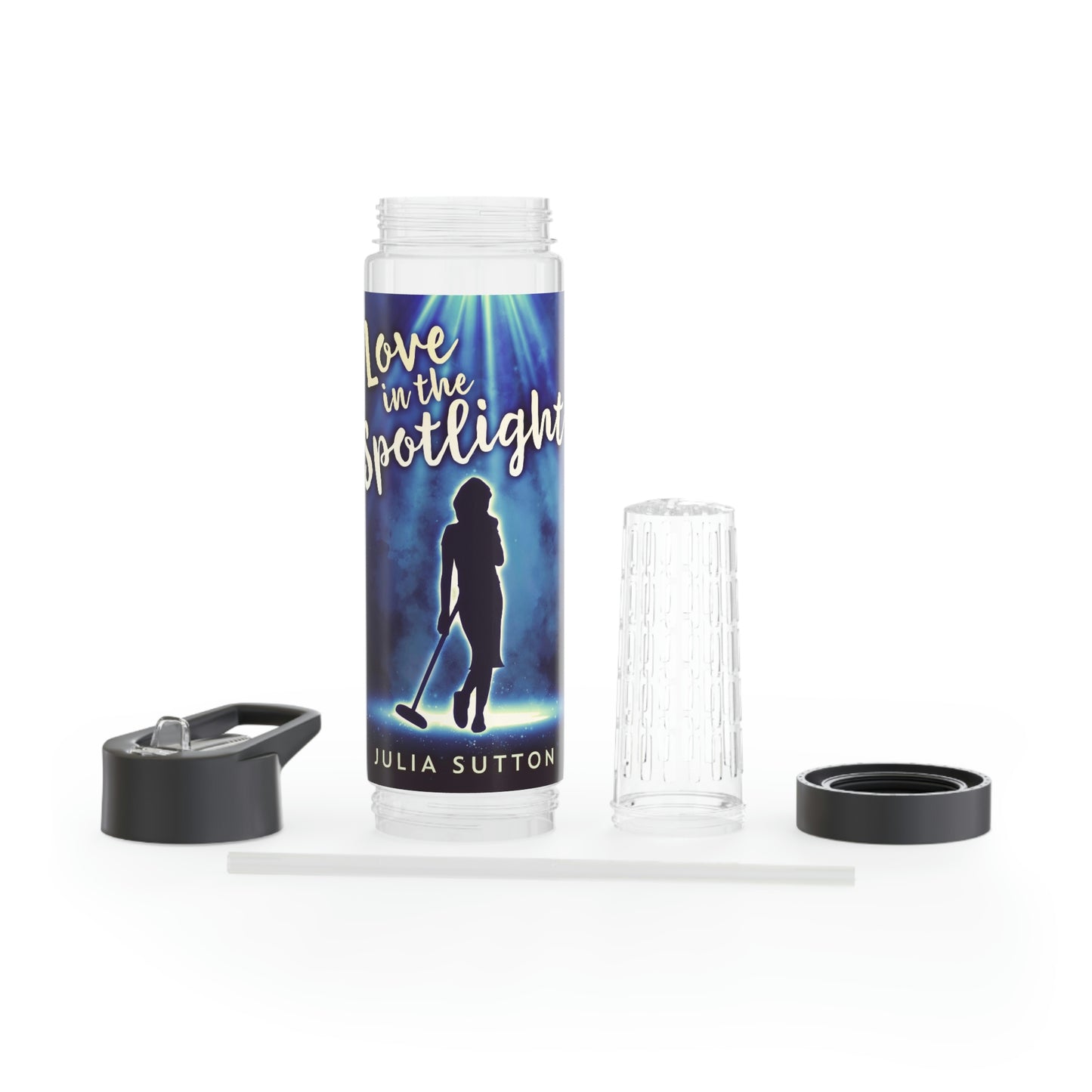 Add flavor and personality to your water with this infuser bottle. Twist the base off to access the infuser and add fruits, tea leaves, or anything you desire to enhance the flavor of your water. On the top, you'll find a twist-on lid with a flip-top drinking sprout for a seamless drinking experience. This infuser is excellent for using at home, during outdoor excursions, or at the gym as a sports bottle. The cover art in this infuser water bottle is from Julia Sutton's book, Love In The Spotlight.