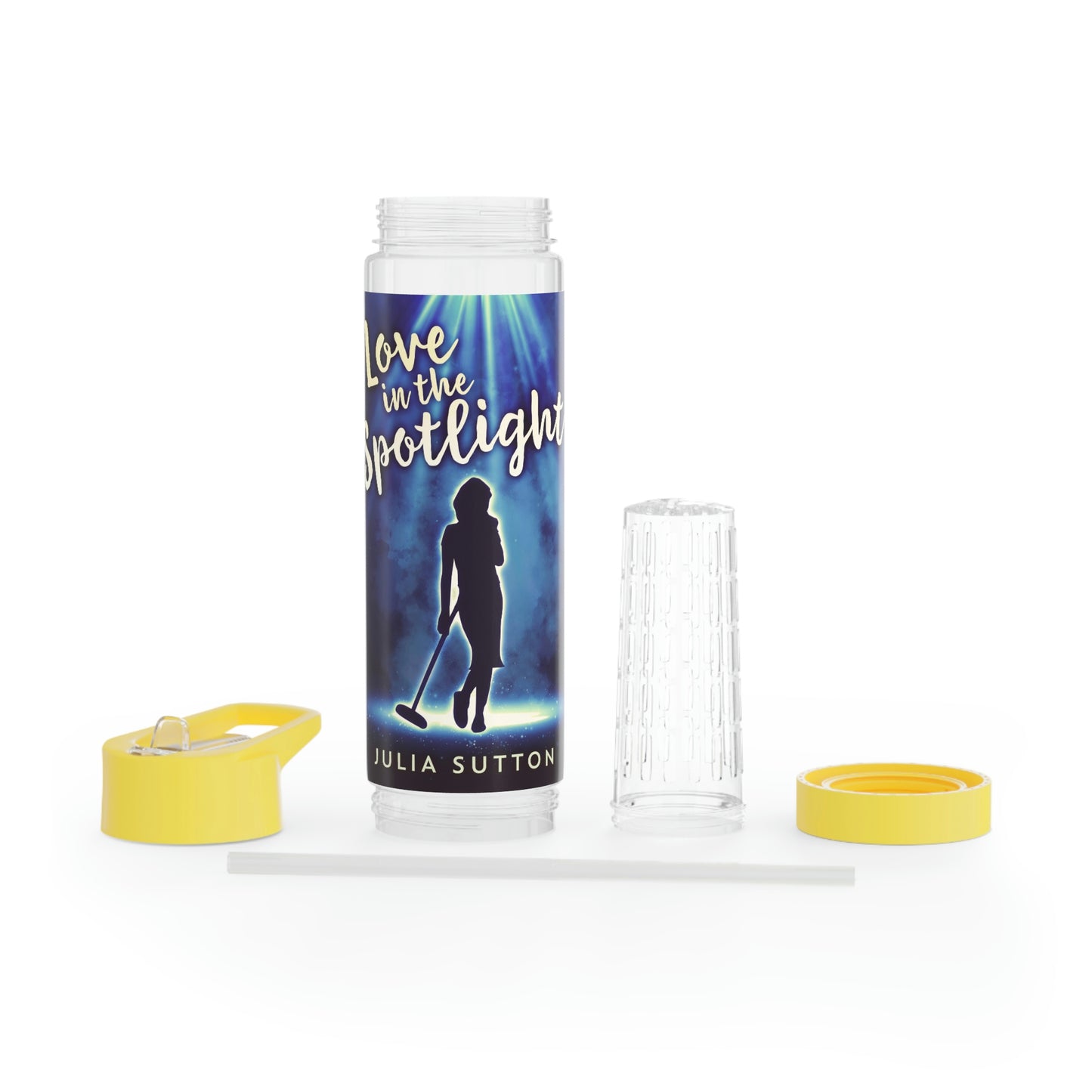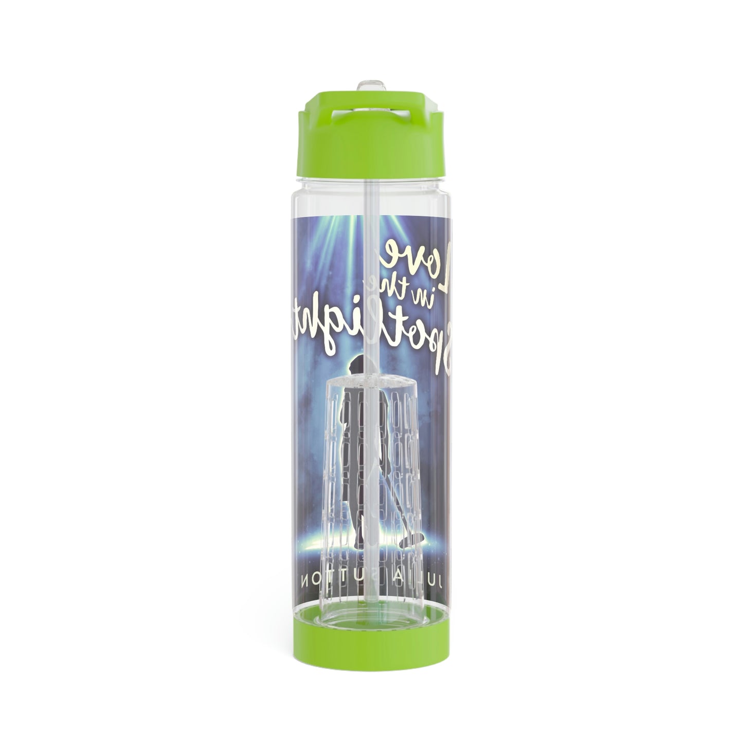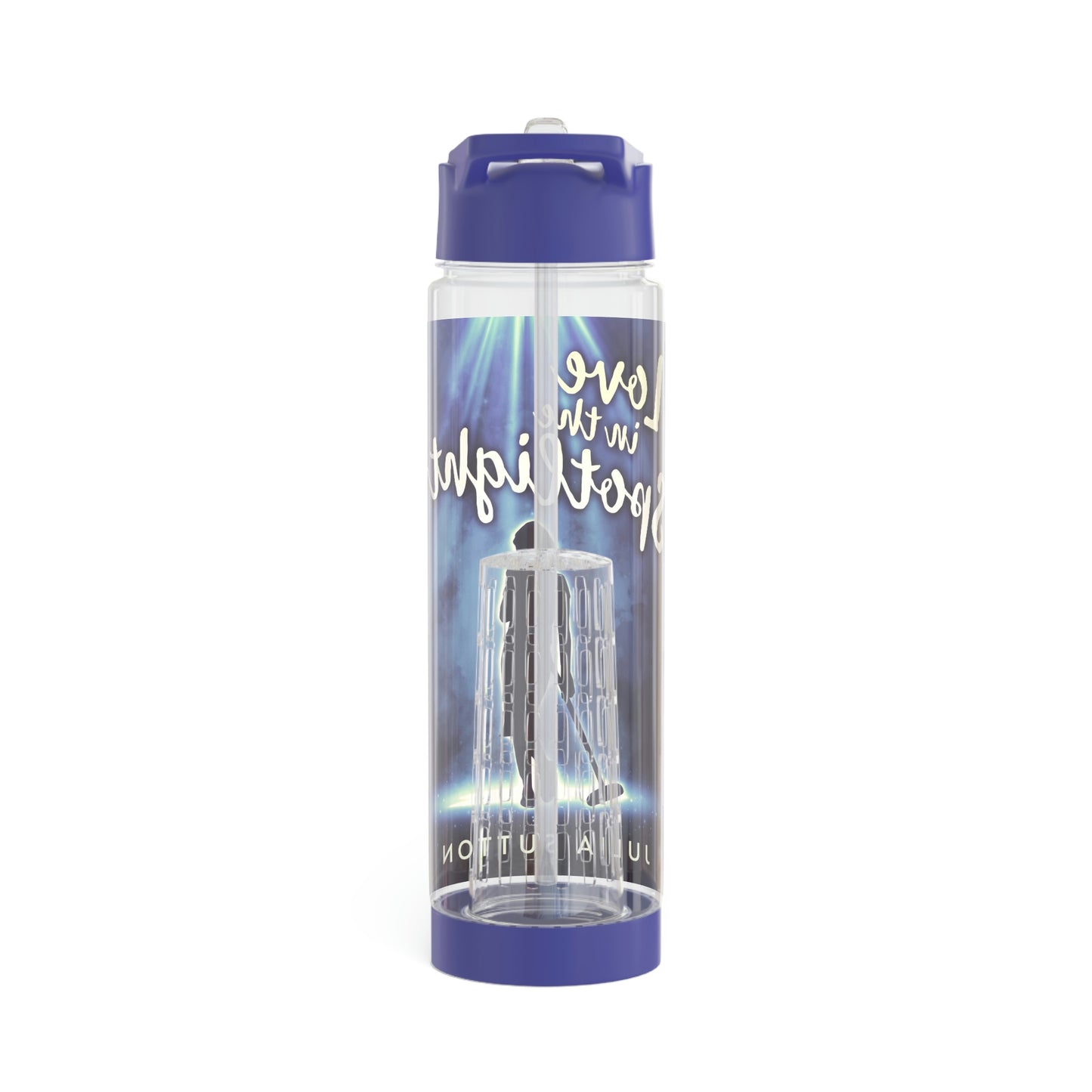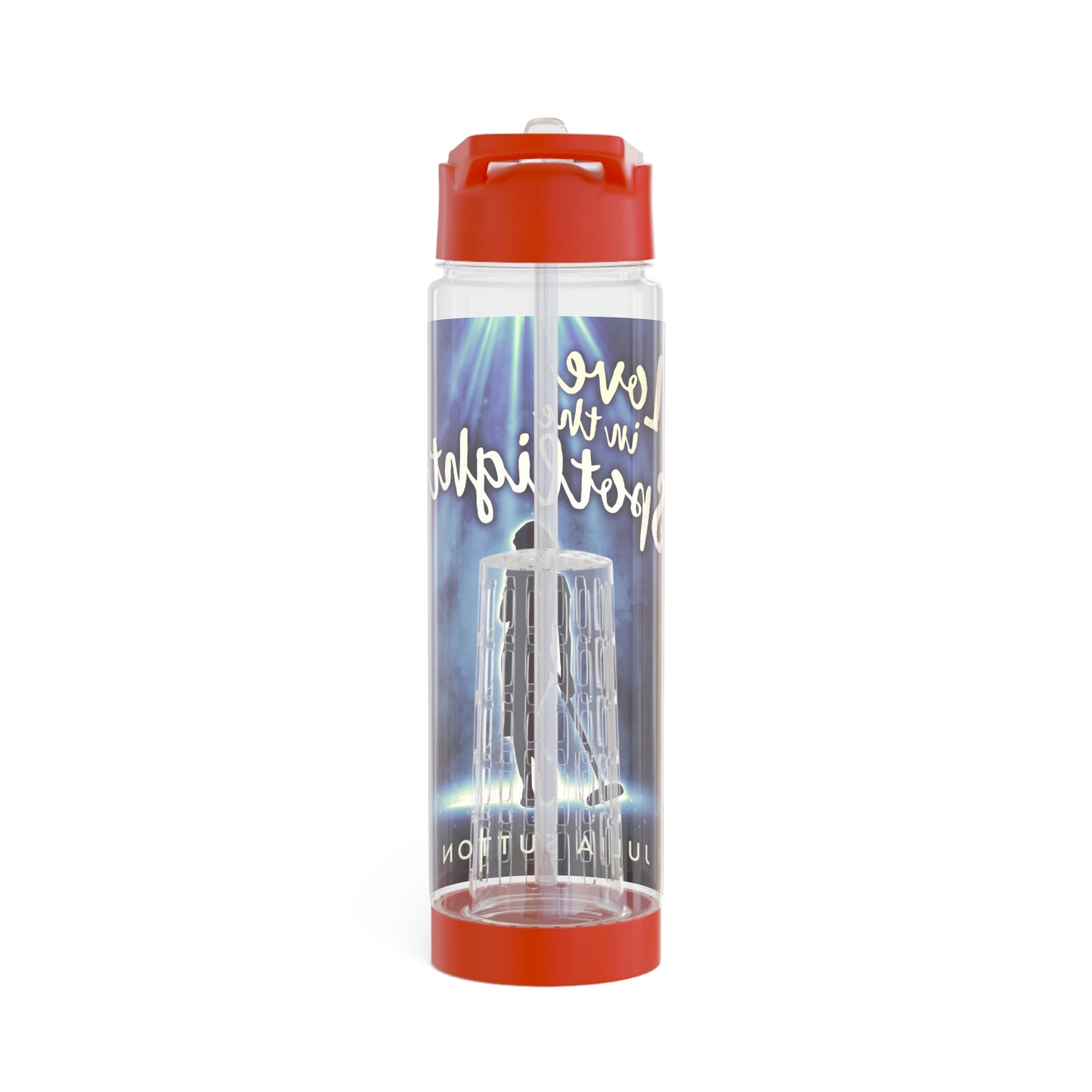 Add flavor and personality to your water with this infuser bottle. Twist the base off to access the infuser and add fruits, tea leaves, or anything you desire to enhance the flavor of your water. On the top, you'll find a twist-on lid with a flip-top drinking sprout for a seamless drinking experience. This infuser is excellent for using at home, during outdoor excursions, or at the gym as a sports bottle. The cover art in this infuser water bottle is from Julia Sutton's book, Love In The Spotlight.