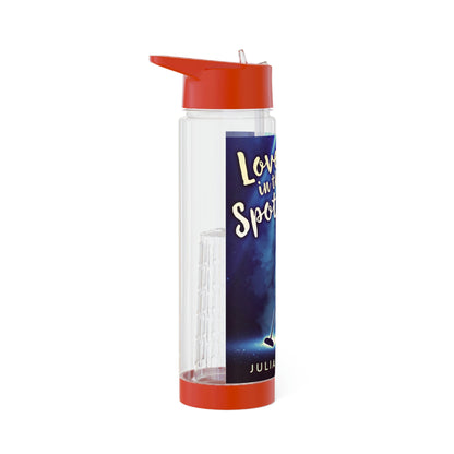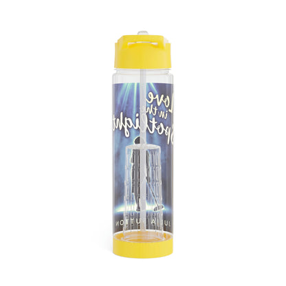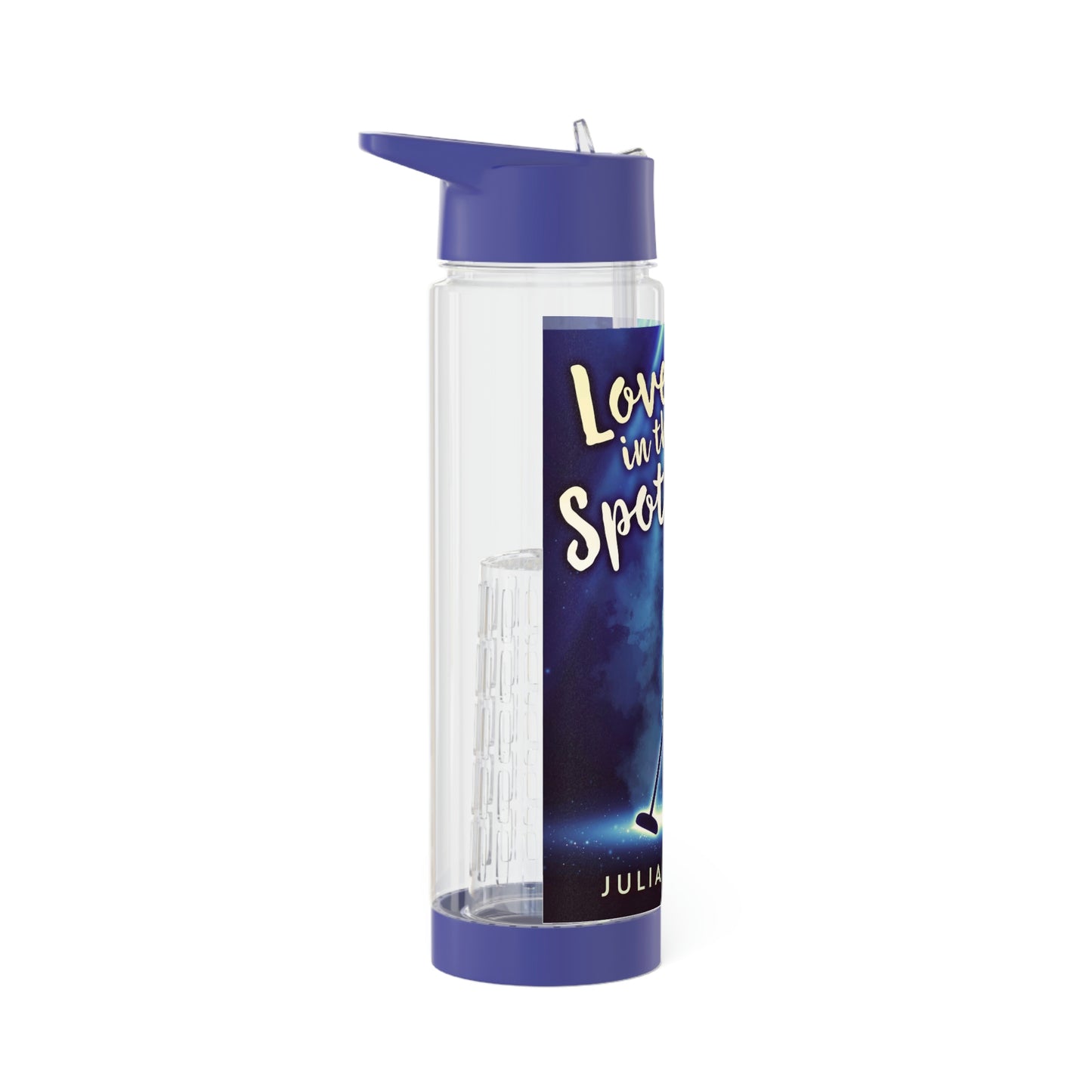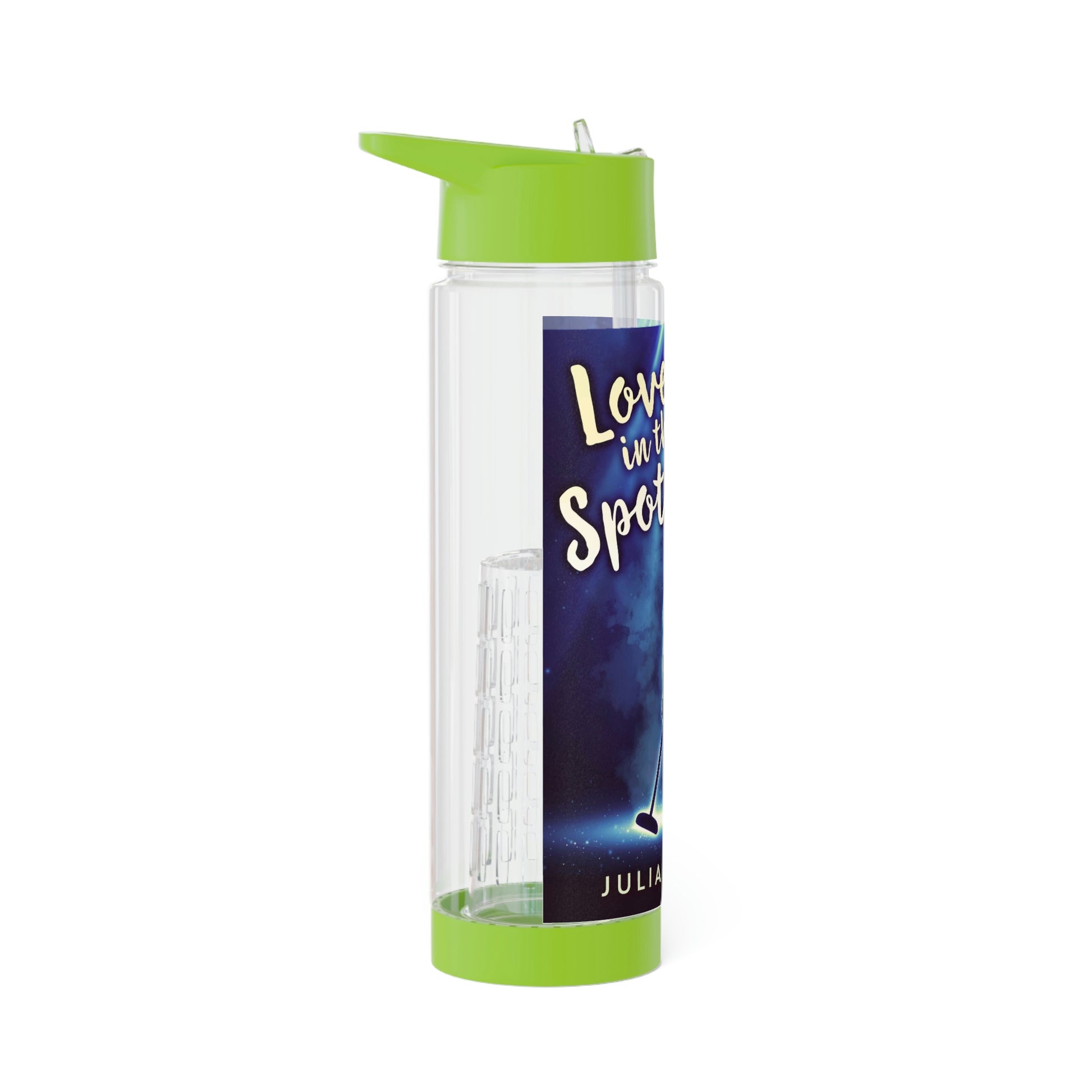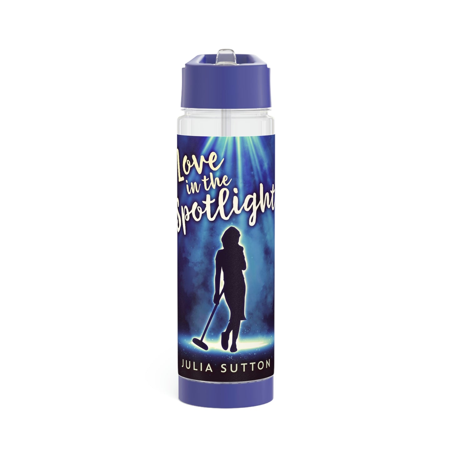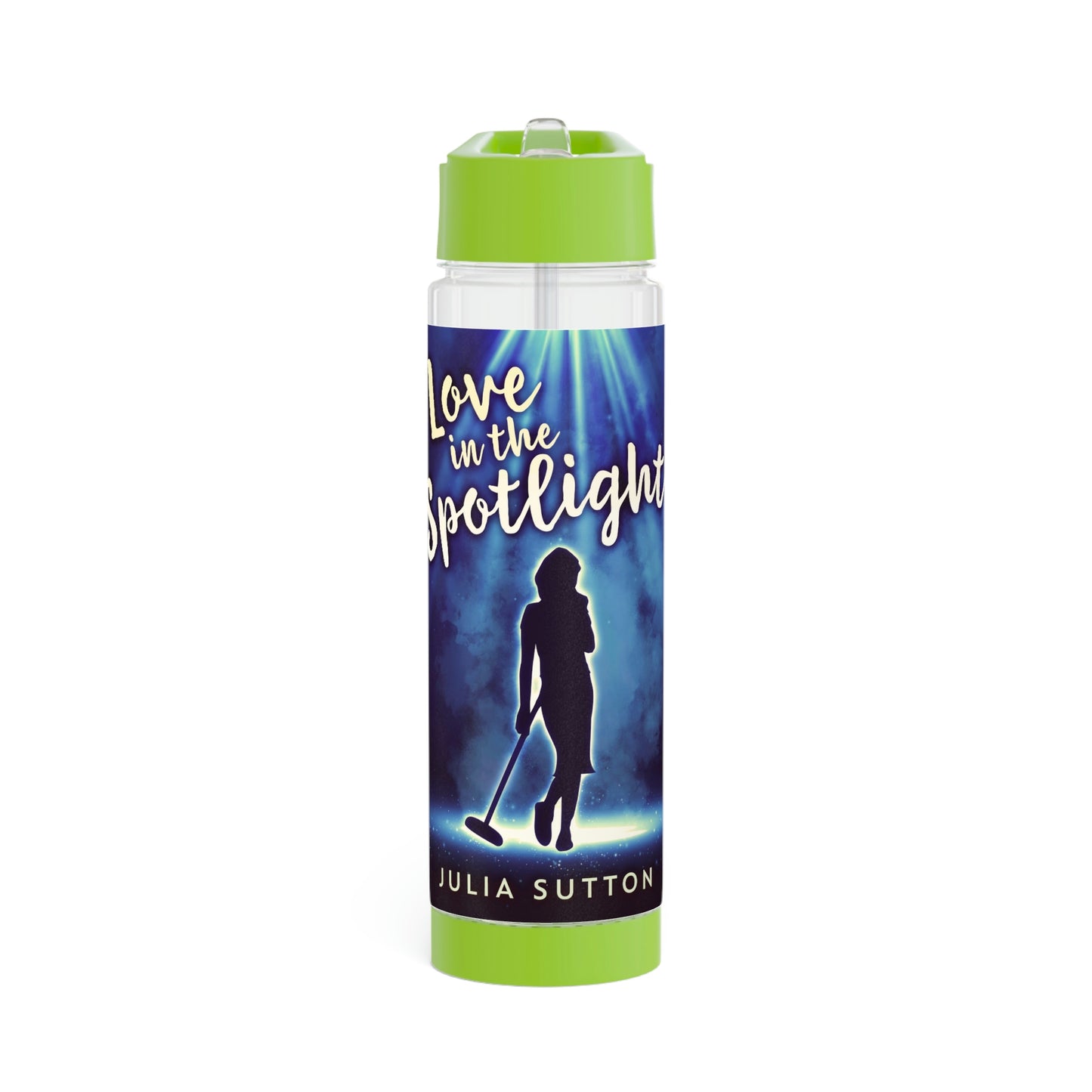 Add flavor and personality to your water with this infuser bottle. Twist the base off to access the infuser and add fruits, tea leaves, or anything you desire to enhance the flavor of your water. On the top, you'll find a twist-on lid with a flip-top drinking sprout for a seamless drinking experience. This infuser is excellent for using at home, during outdoor excursions, or at the gym as a sports bottle. The cover art in this infuser water bottle is from Julia Sutton's book, Love In The Spotlight.