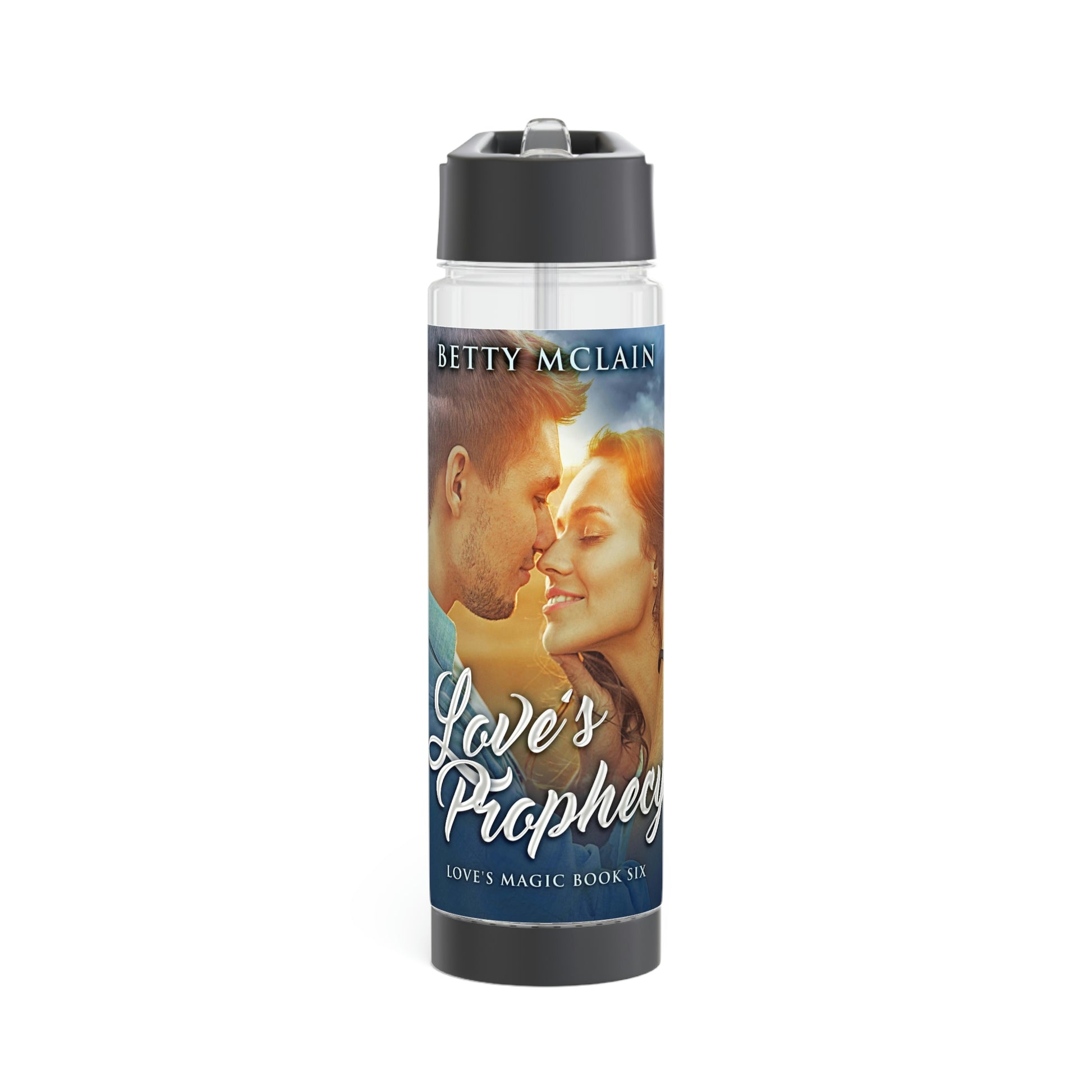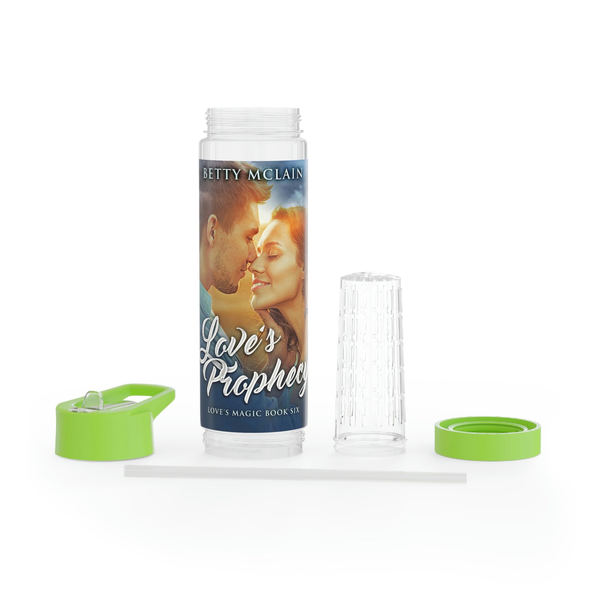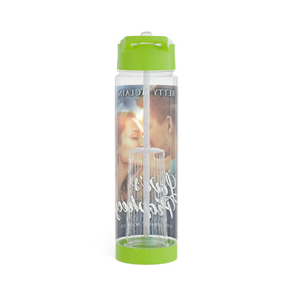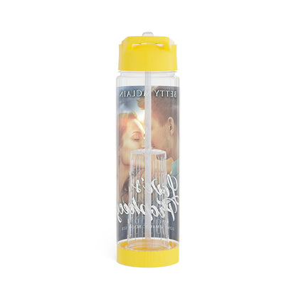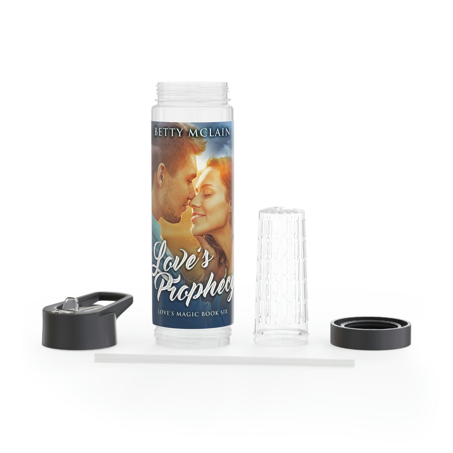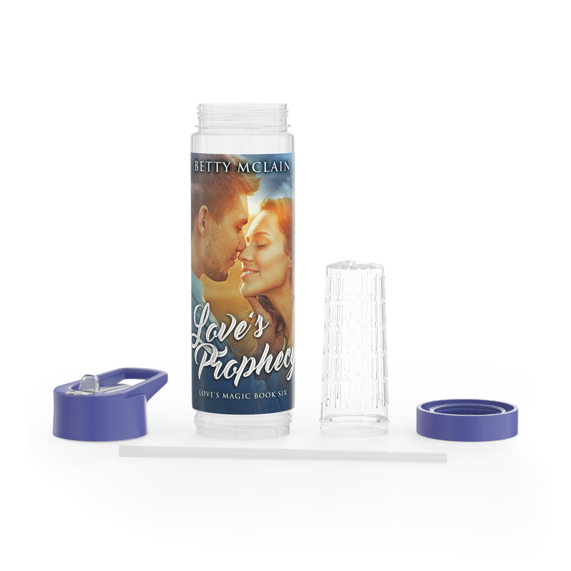 Add flavor and personality to your water with this infuser bottle. Twist the base off to access the infuser and add fruits, tea leaves, or anything you desire to enhance the flavor of your water. On the top, you'll find a twist-on lid with a flip-top drinking sprout for a seamless drinking experience. This infuser is excellent for using at home, during outdoor excursions, or at the gym as a sports bottle. The cover art in this infuser water bottle is from Betty McLain's book, Love's Prophecy.