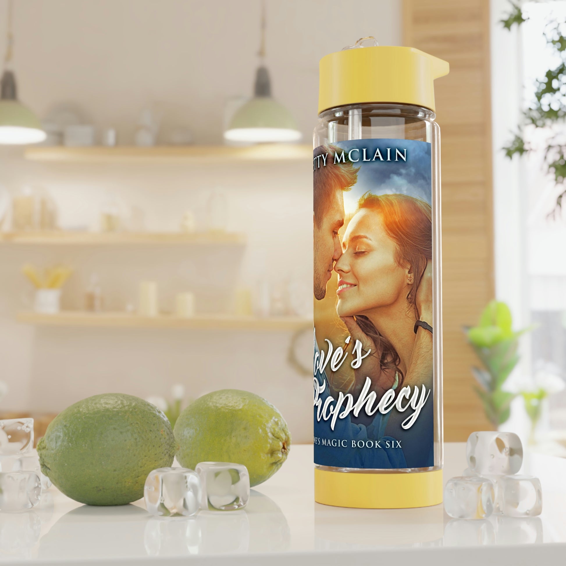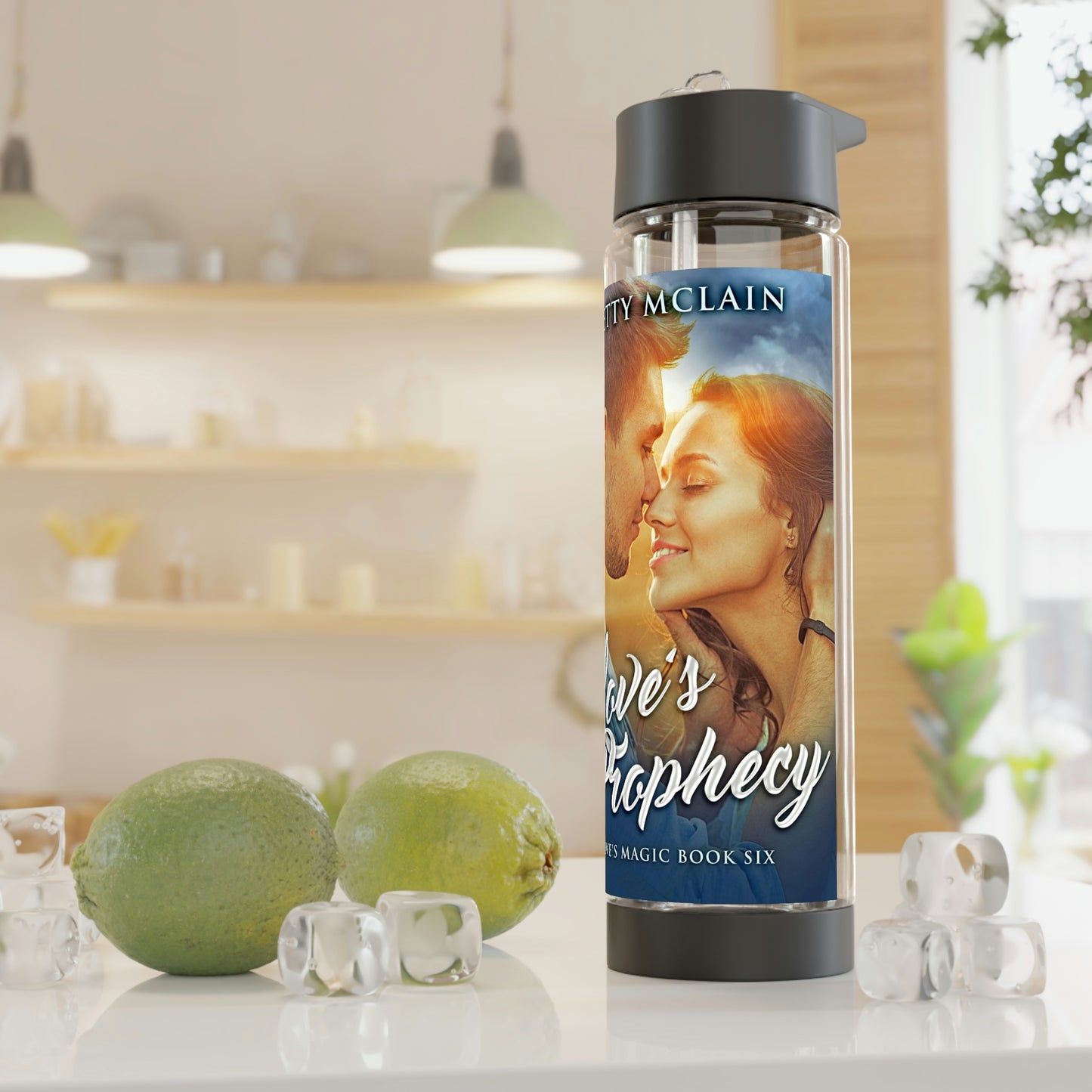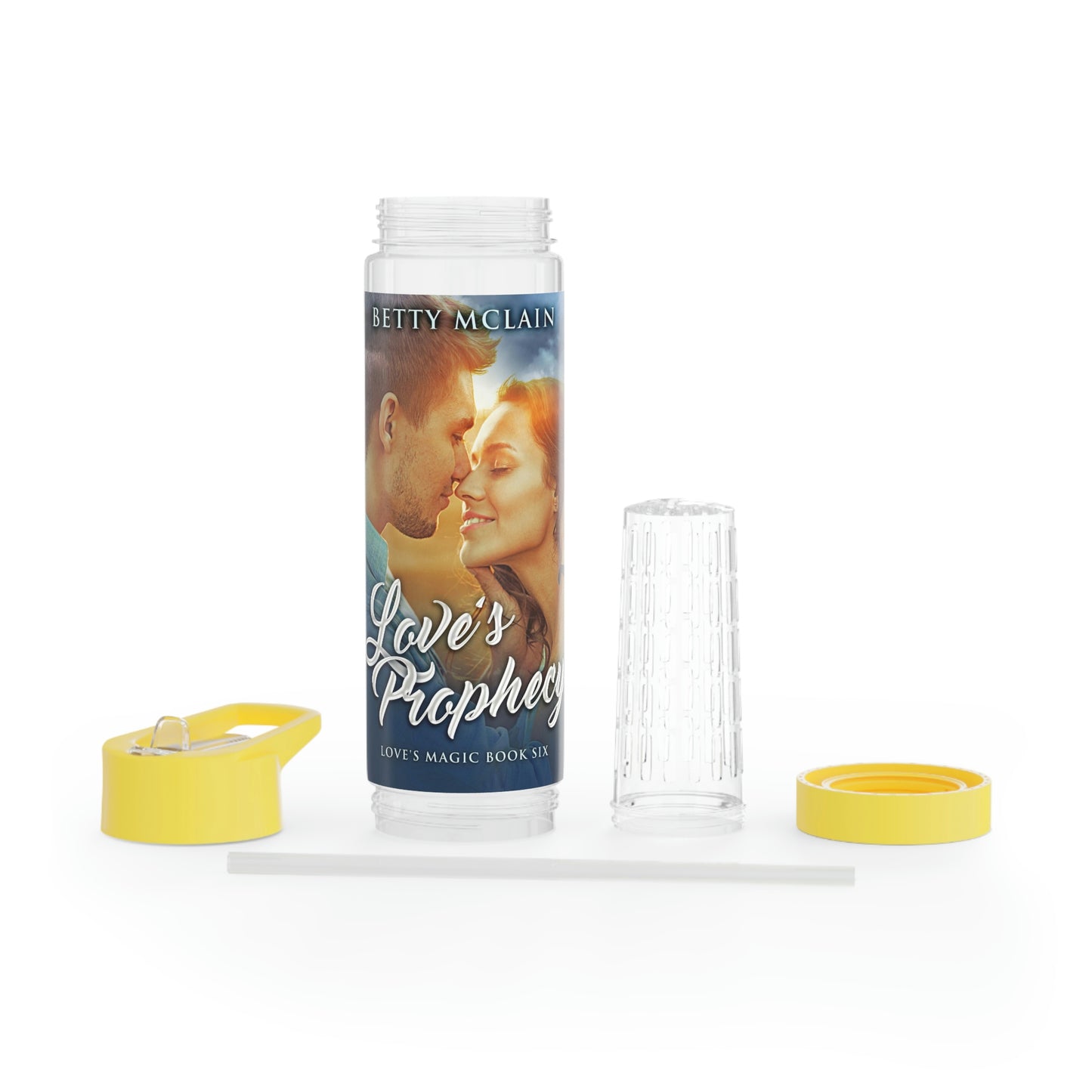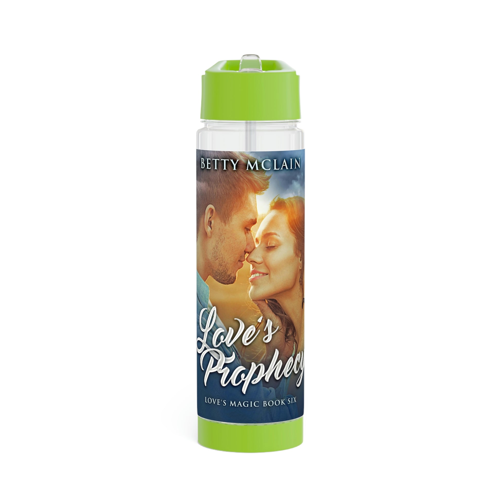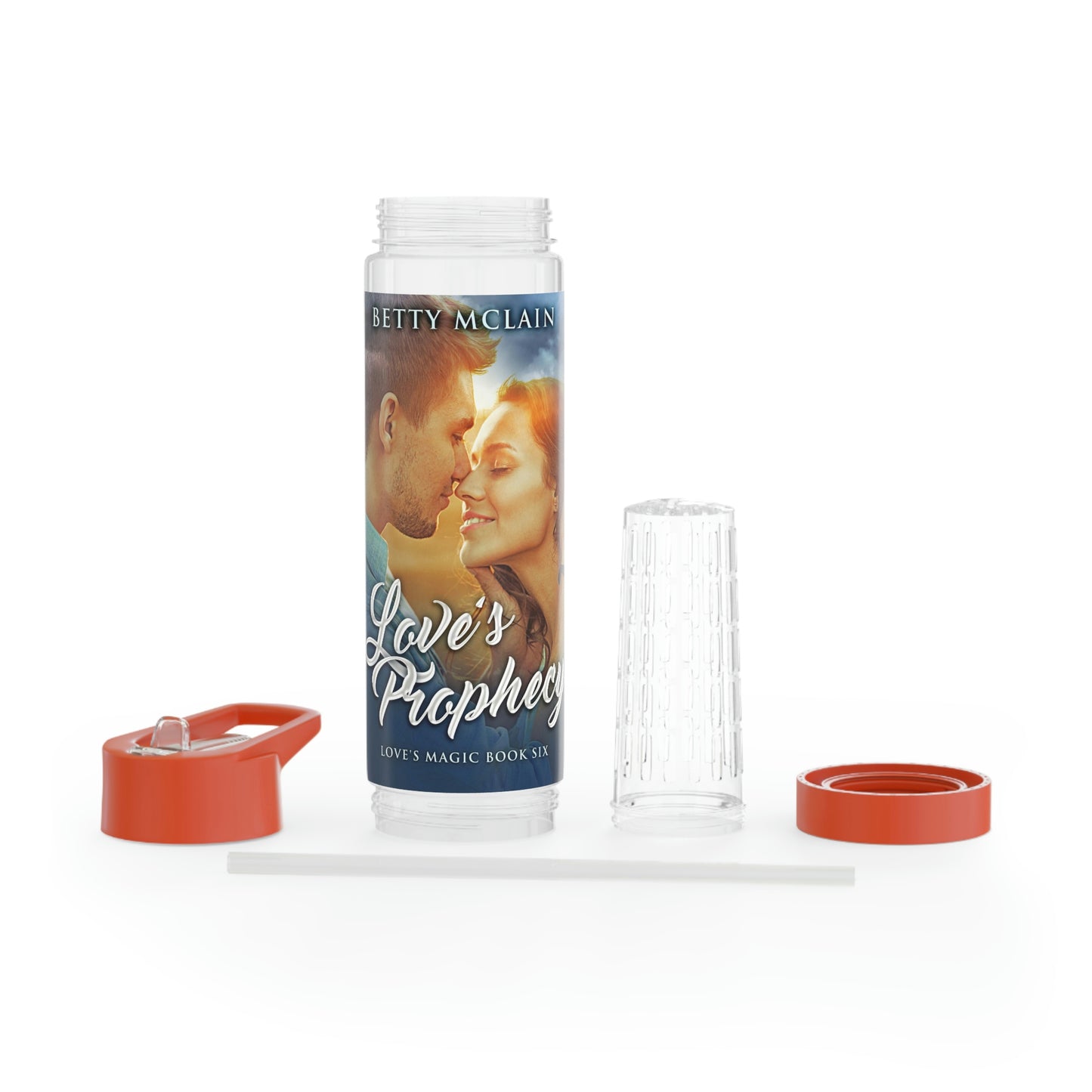 Add flavor and personality to your water with this infuser bottle. Twist the base off to access the infuser and add fruits, tea leaves, or anything you desire to enhance the flavor of your water. On the top, you'll find a twist-on lid with a flip-top drinking sprout for a seamless drinking experience. This infuser is excellent for using at home, during outdoor excursions, or at the gym as a sports bottle. The cover art in this infuser water bottle is from Betty McLain's book, Love's Prophecy.