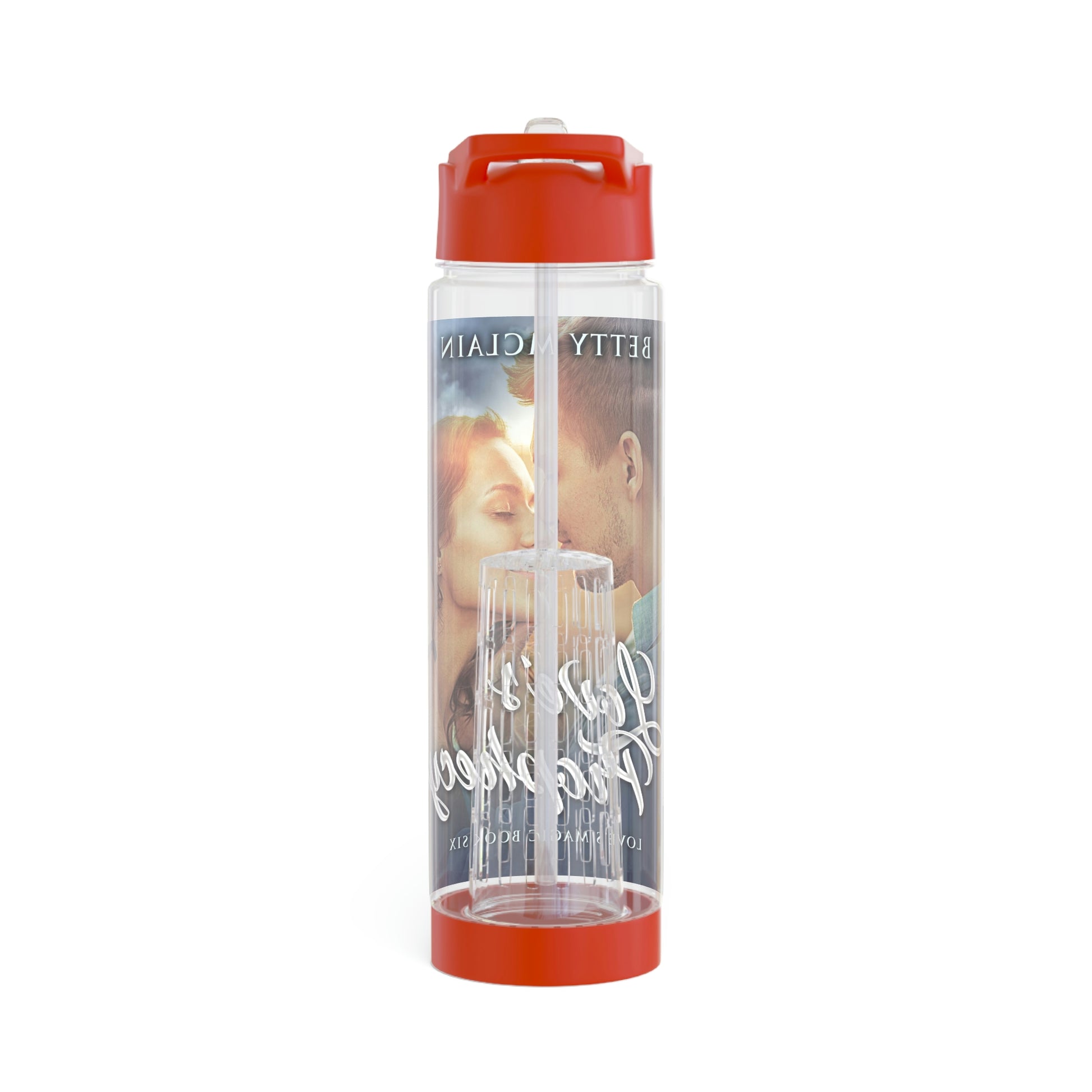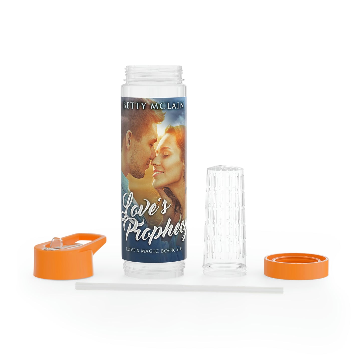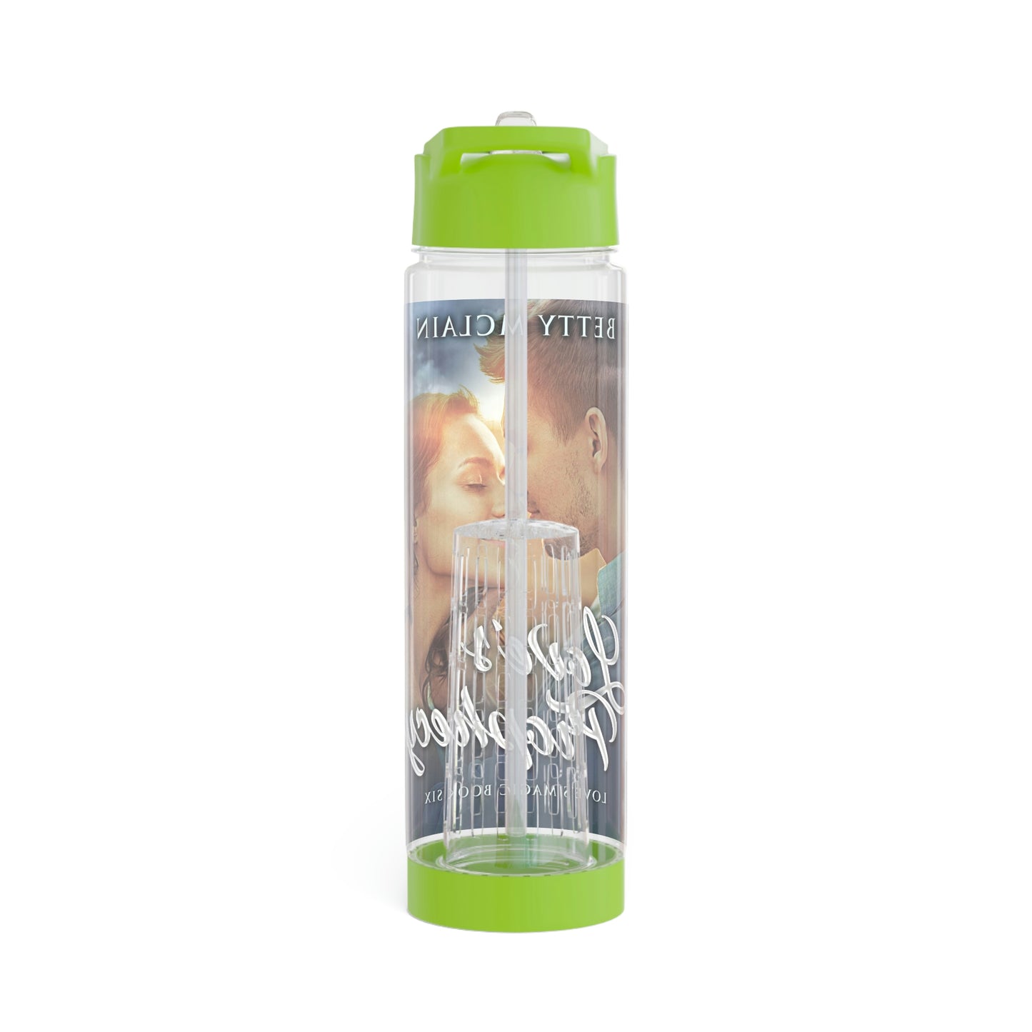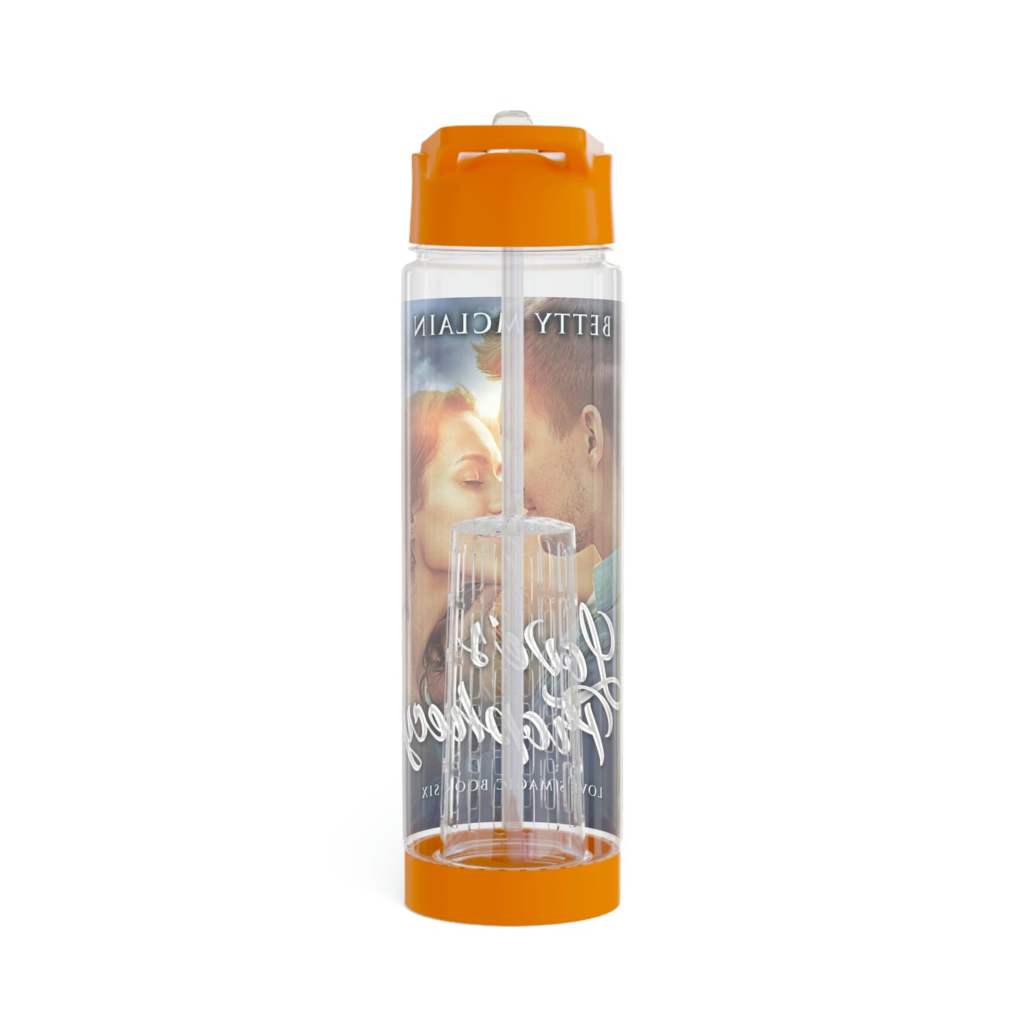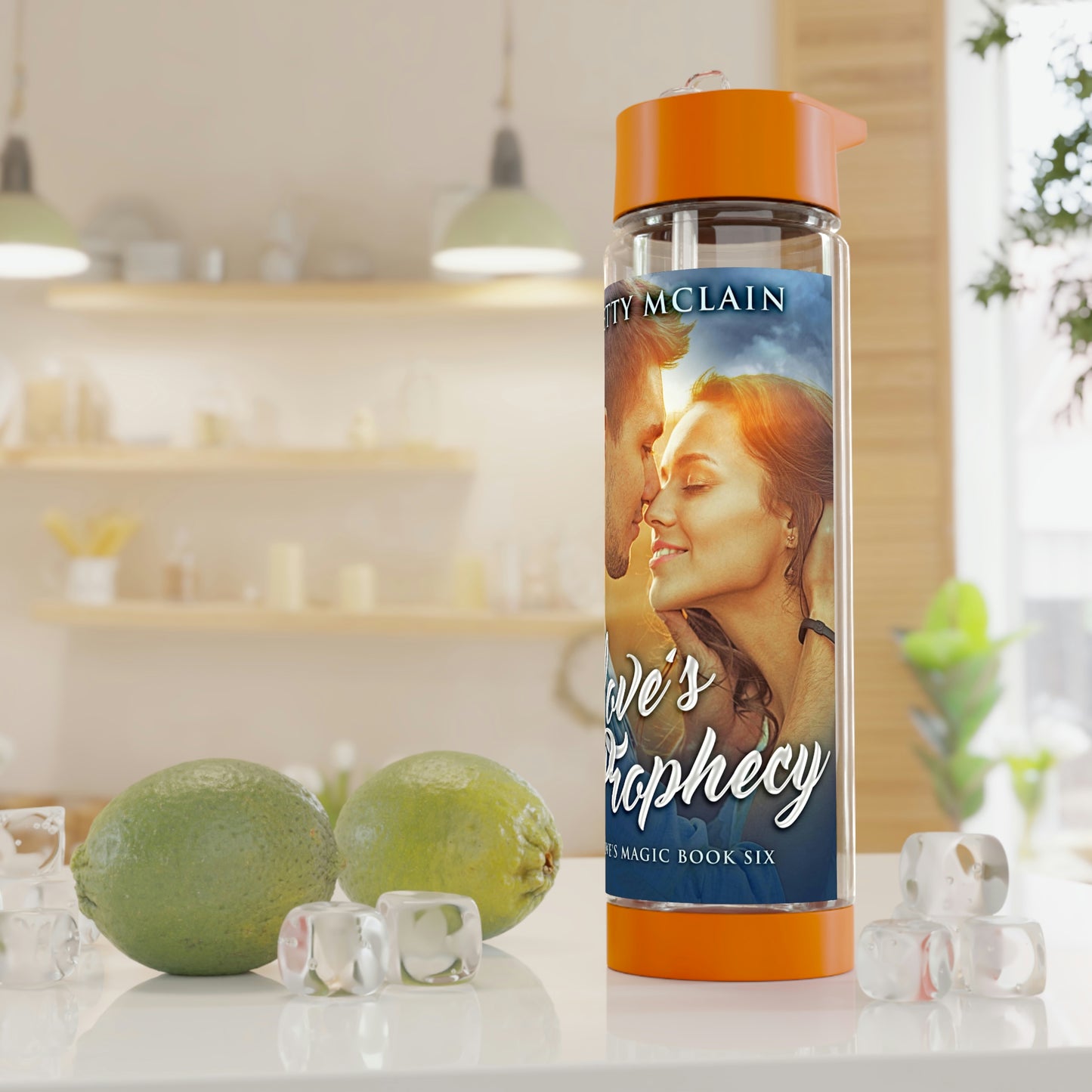Add flavor and personality to your water with this infuser bottle. Twist the base off to access the infuser and add fruits, tea leaves, or anything you desire to enhance the flavor of your water. On the top, you'll find a twist-on lid with a flip-top drinking sprout for a seamless drinking experience. This infuser is excellent for using at home, during outdoor excursions, or at the gym as a sports bottle. The cover art in this infuser water bottle is from Betty McLain's book, Love's Prophecy.