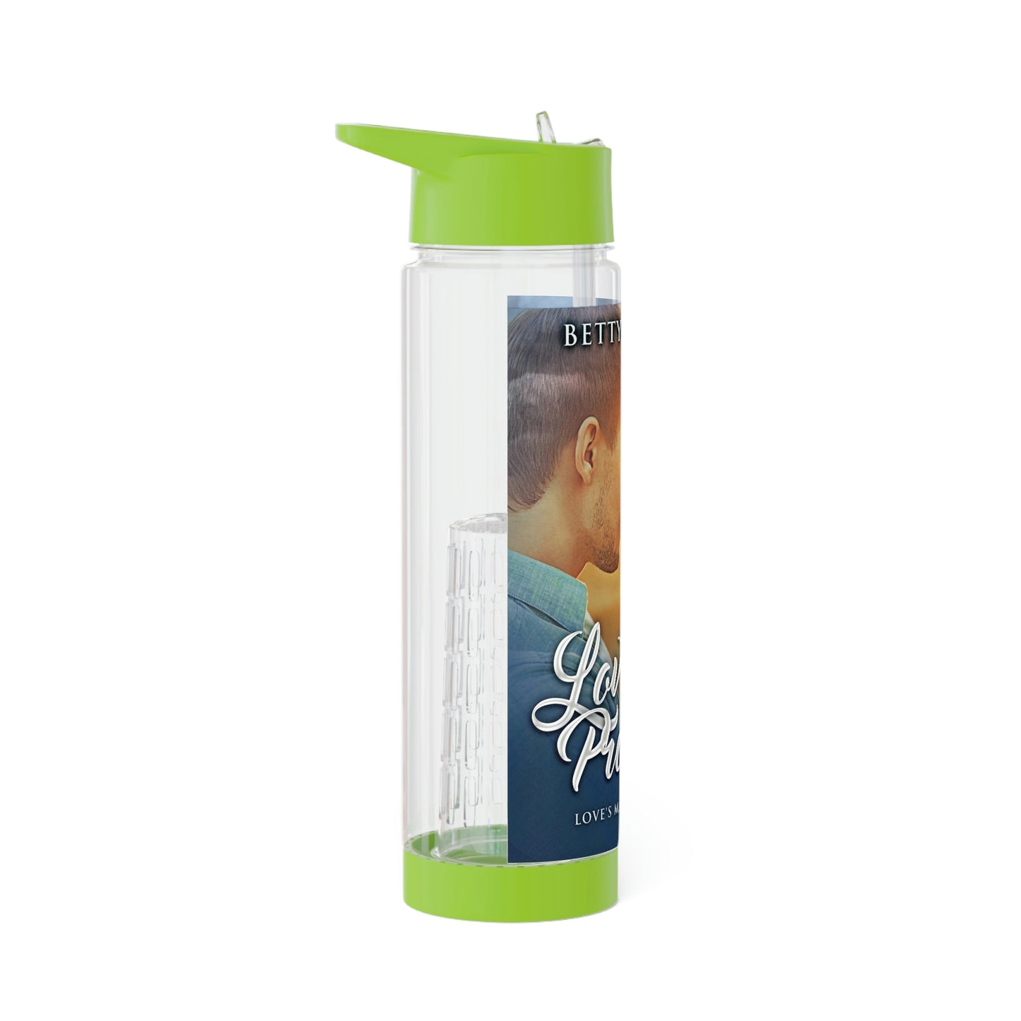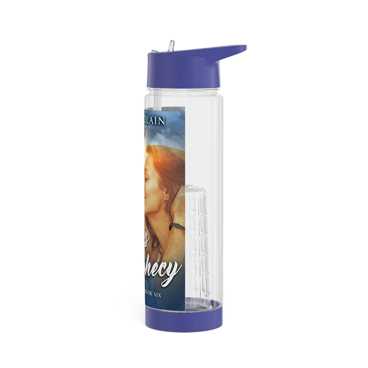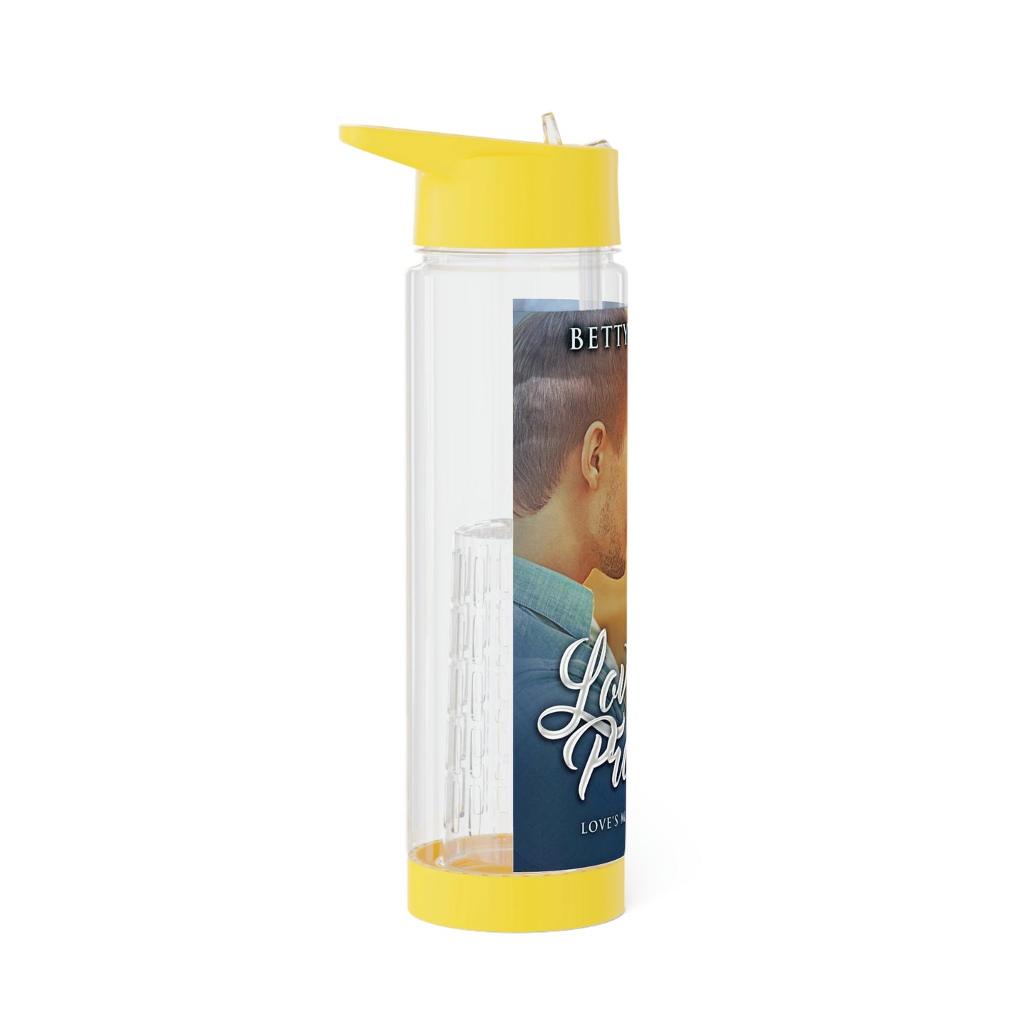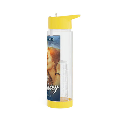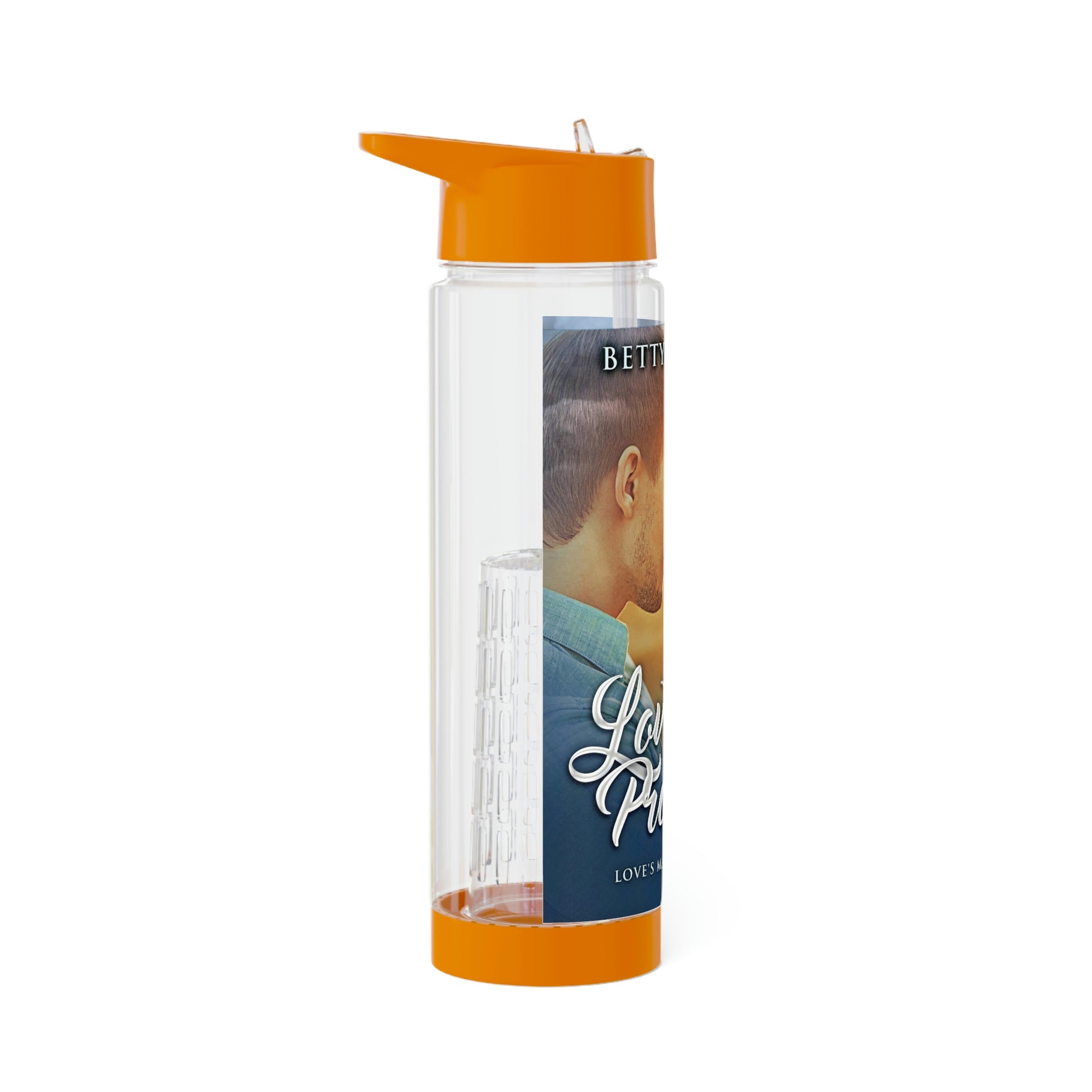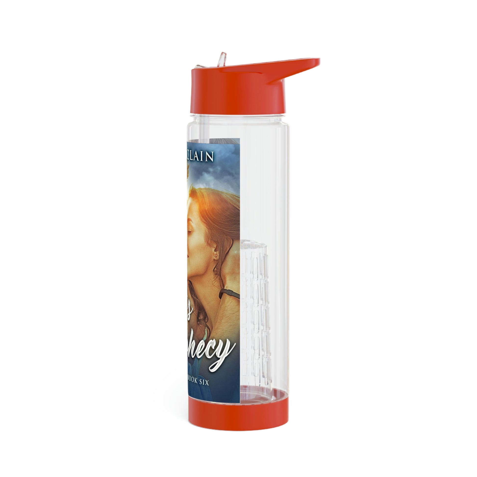 Add flavor and personality to your water with this infuser bottle. Twist the base off to access the infuser and add fruits, tea leaves, or anything you desire to enhance the flavor of your water. On the top, you'll find a twist-on lid with a flip-top drinking sprout for a seamless drinking experience. This infuser is excellent for using at home, during outdoor excursions, or at the gym as a sports bottle. The cover art in this infuser water bottle is from Betty McLain's book, Love's Prophecy.