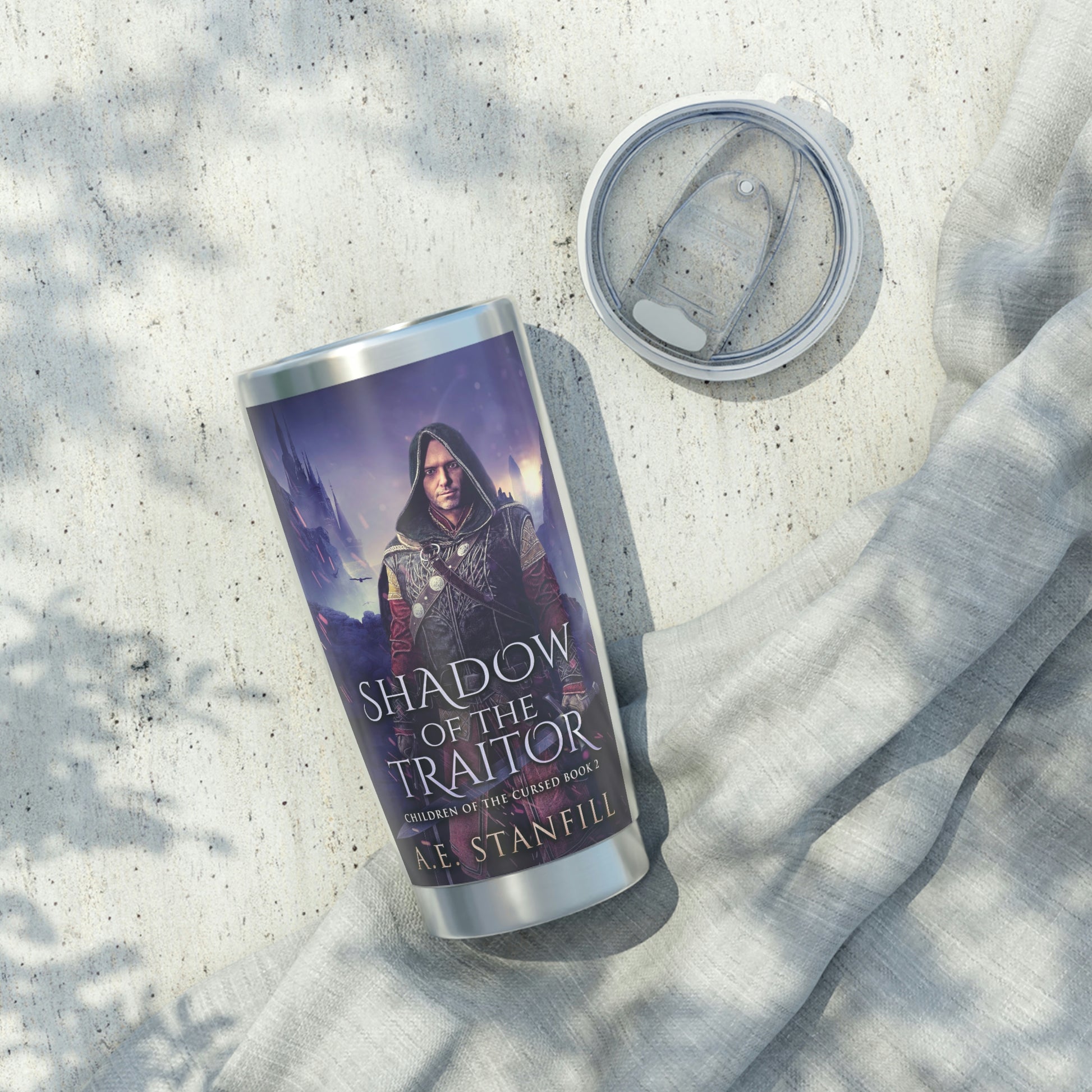 Minimize your plastic footprint with style. This tumbler fits perfectly into car cup holders, and the rubber gasket makes it spill-resistant on bumpier roads. The double-wall insulation makes sure drinks stay at the right temperature until the next pit stop. The cover art in this 20 oz tumbler is from A.E. Stanfill's book, Shadow Of The Traitor.