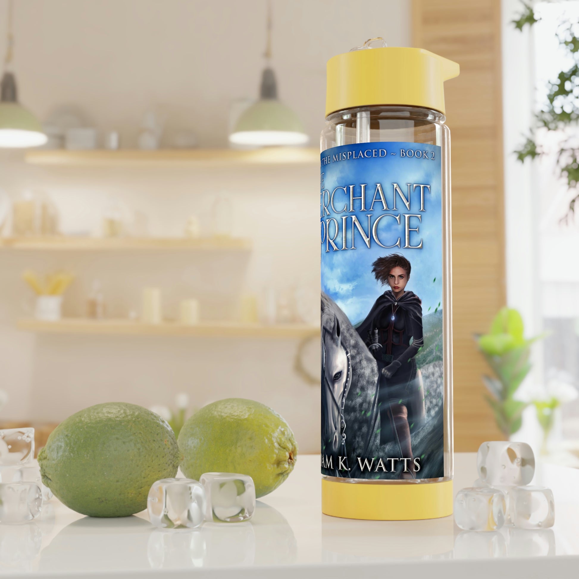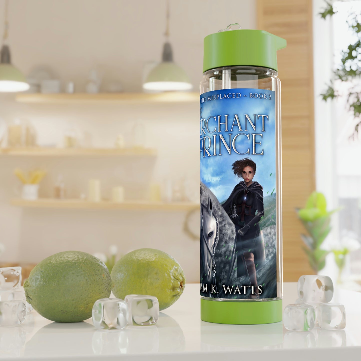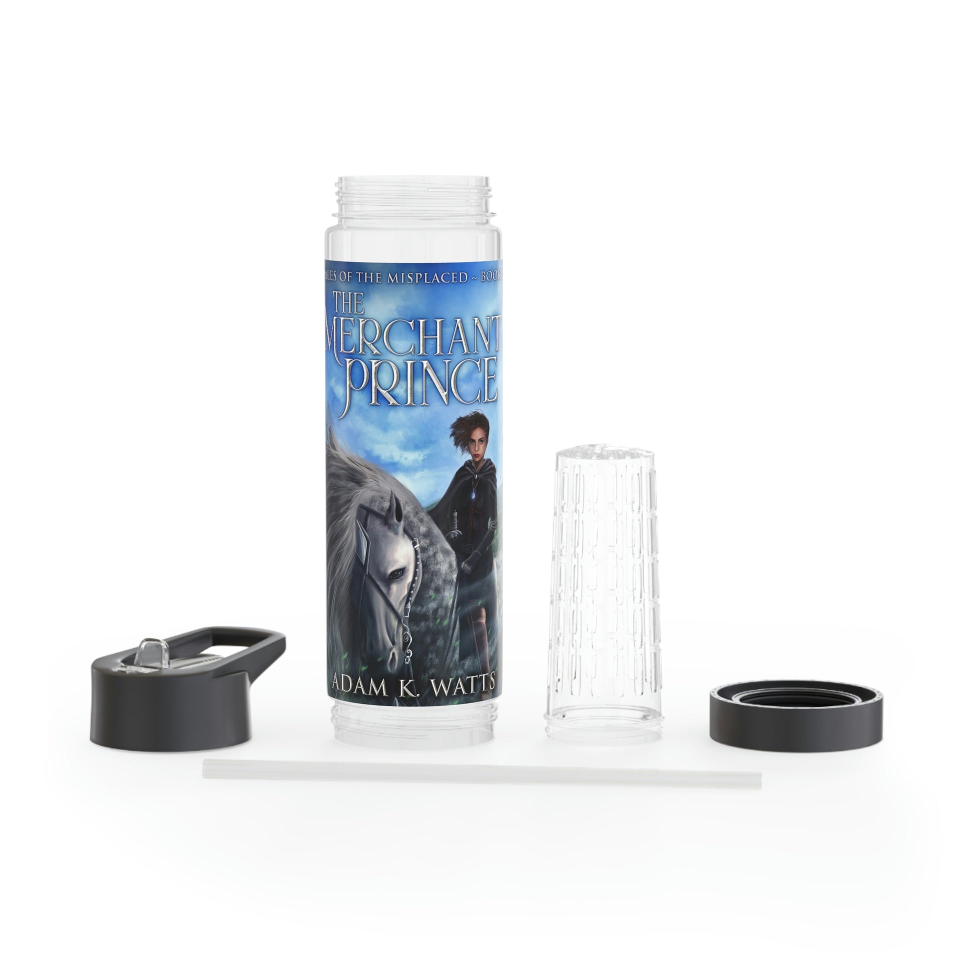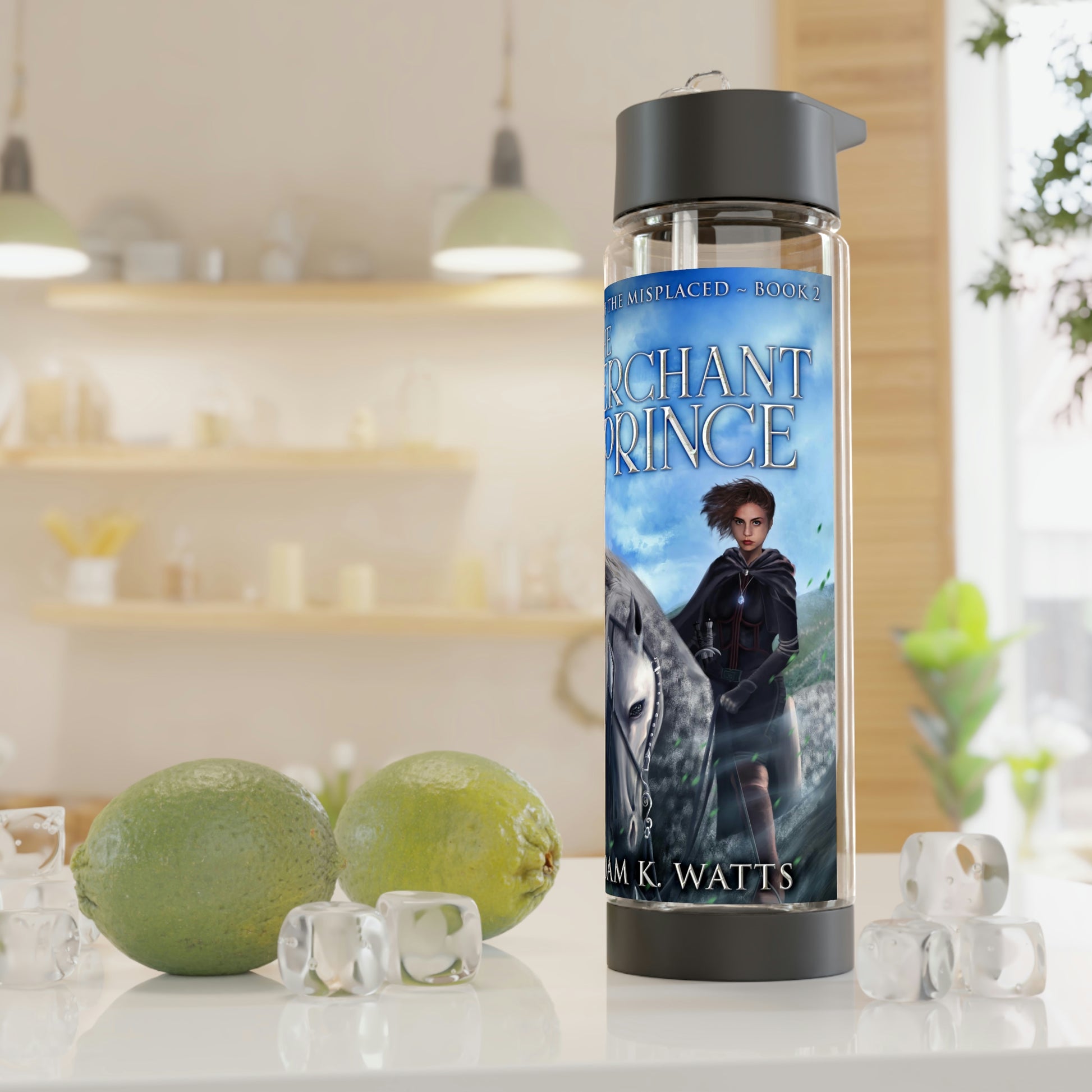 Add flavor and personality to your water with this infuser bottle. Twist the base off to access the infuser and add fruits, tea leaves, or anything you desire to enhance the flavor of your water. On the top, you'll find a twist-on lid with a flip-top drinking sprout for a seamless drinking experience. This infuser is excellent for using at home, during outdoor excursions, or at the gym as a sports bottle. The cover art in this infuser water bottle is from Adam K. Watts's book, The Merchant Prince.