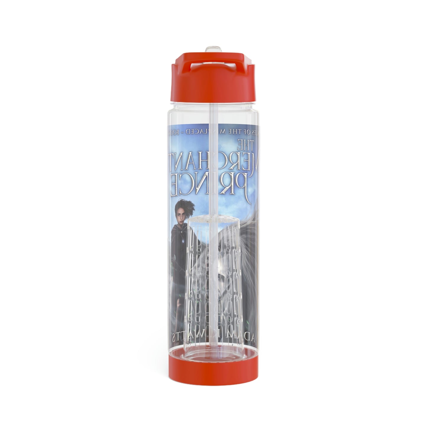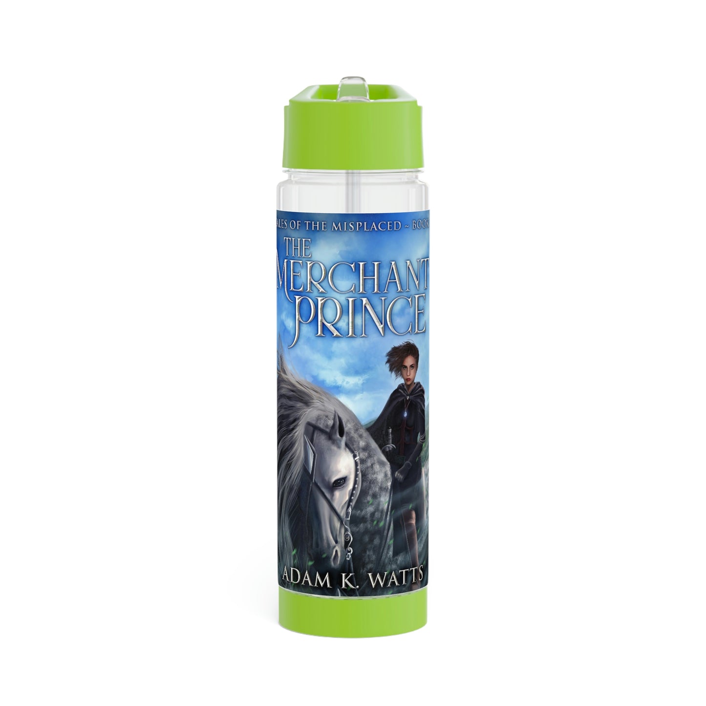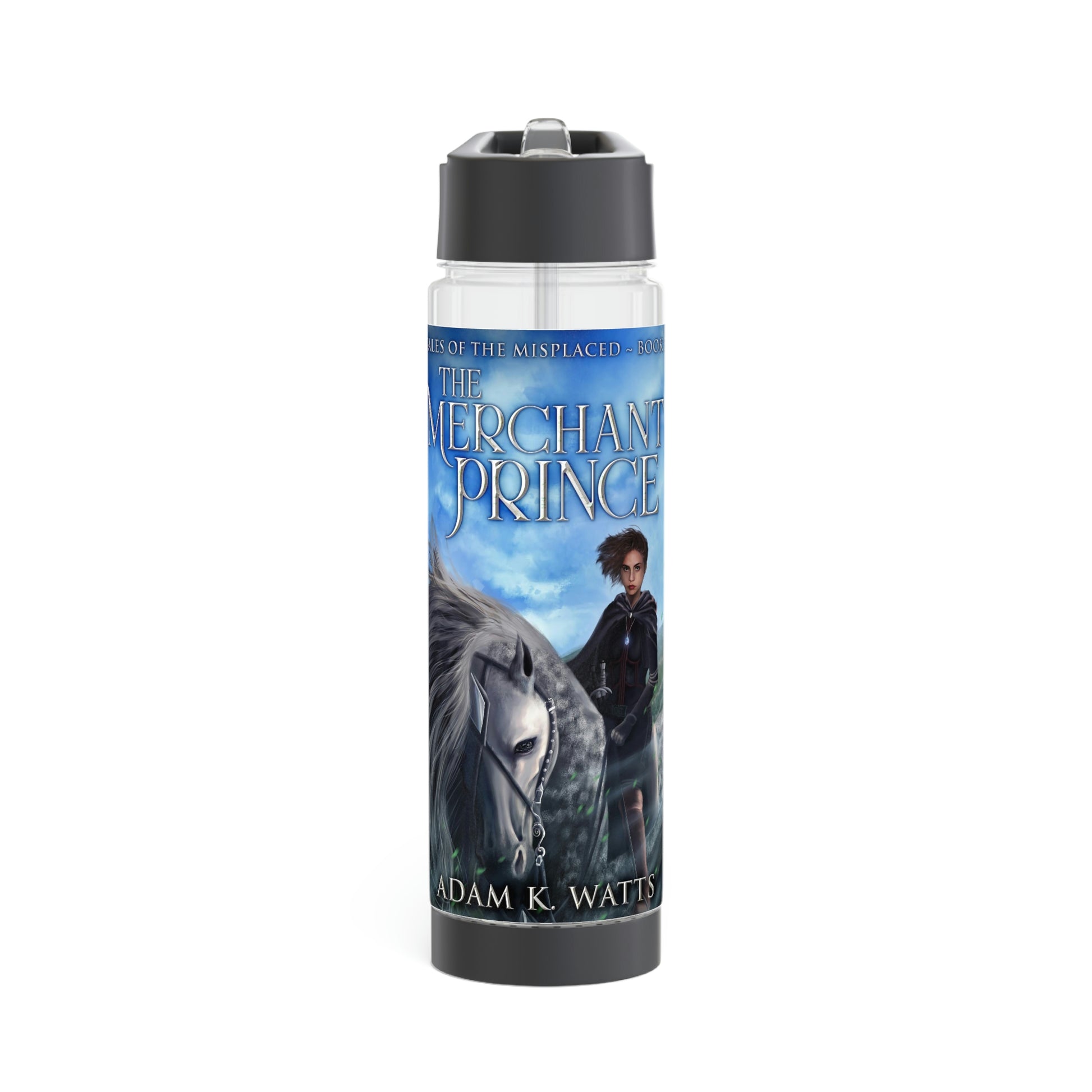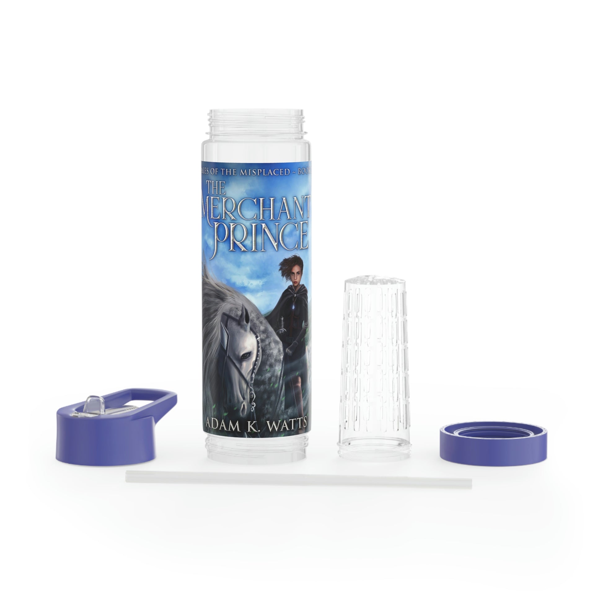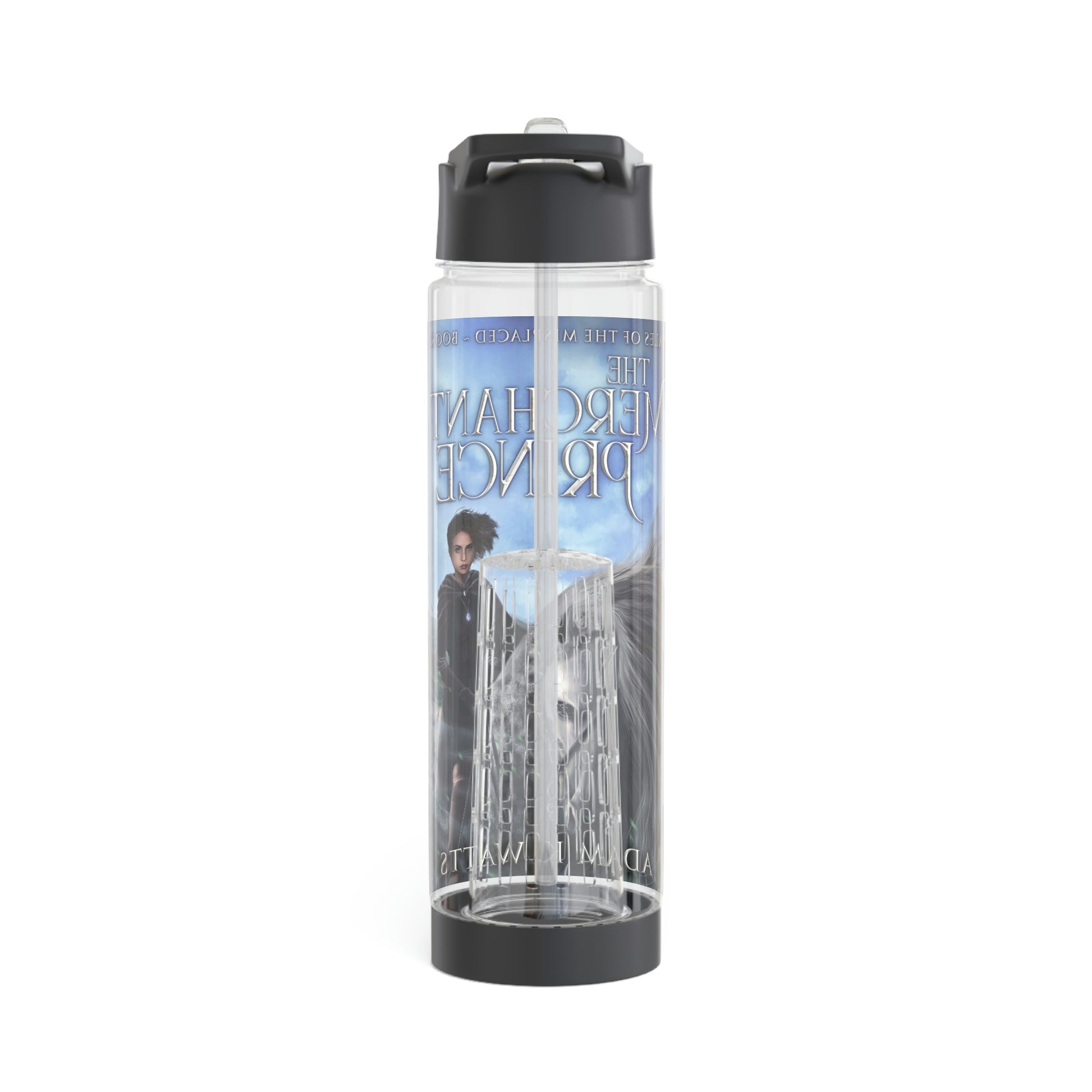 Add flavor and personality to your water with this infuser bottle. Twist the base off to access the infuser and add fruits, tea leaves, or anything you desire to enhance the flavor of your water. On the top, you'll find a twist-on lid with a flip-top drinking sprout for a seamless drinking experience. This infuser is excellent for using at home, during outdoor excursions, or at the gym as a sports bottle. The cover art in this infuser water bottle is from Adam K. Watts's book, The Merchant Prince.