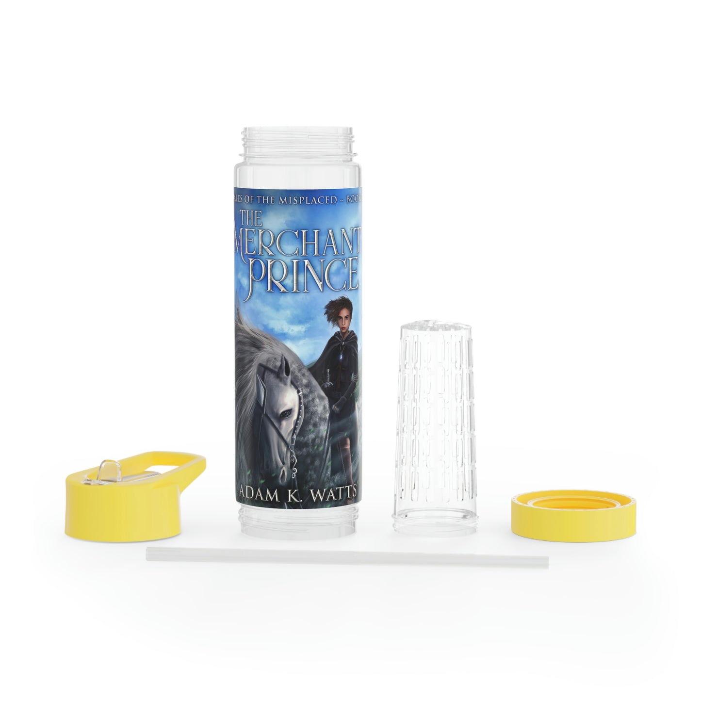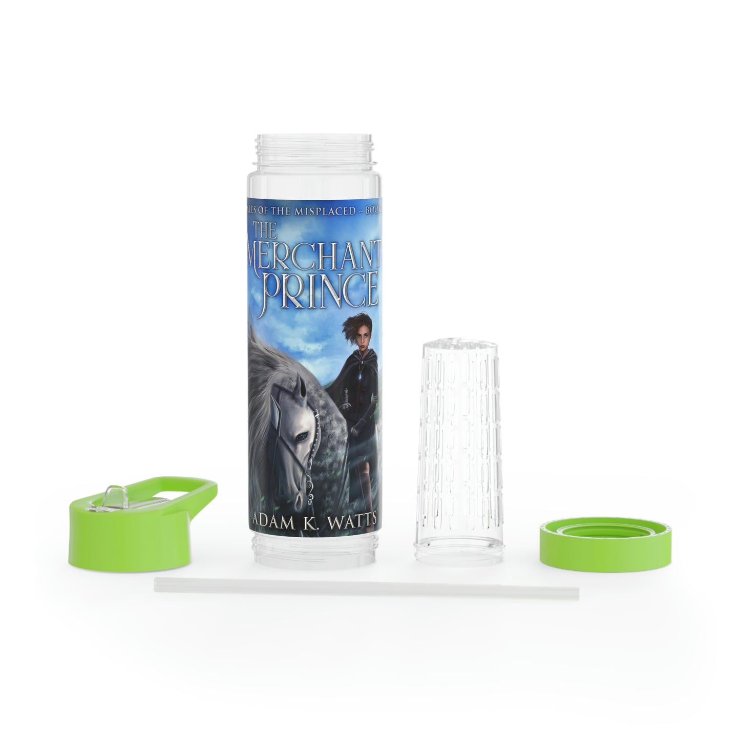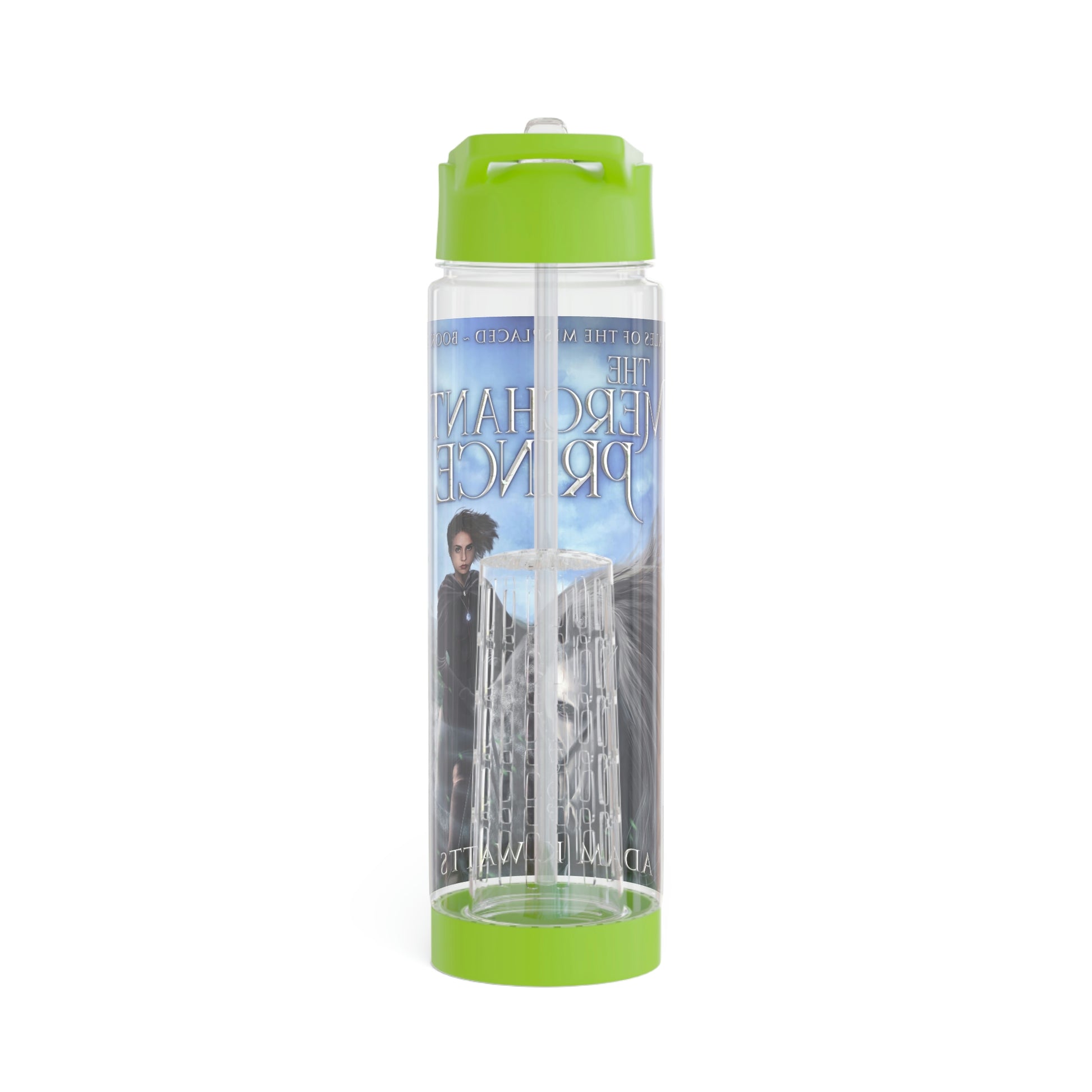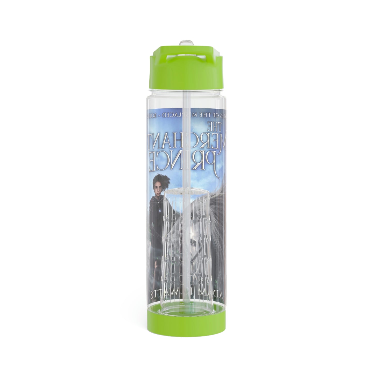 Add flavor and personality to your water with this infuser bottle. Twist the base off to access the infuser and add fruits, tea leaves, or anything you desire to enhance the flavor of your water. On the top, you'll find a twist-on lid with a flip-top drinking sprout for a seamless drinking experience. This infuser is excellent for using at home, during outdoor excursions, or at the gym as a sports bottle. The cover art in this infuser water bottle is from Adam K. Watts's book, The Merchant Prince.