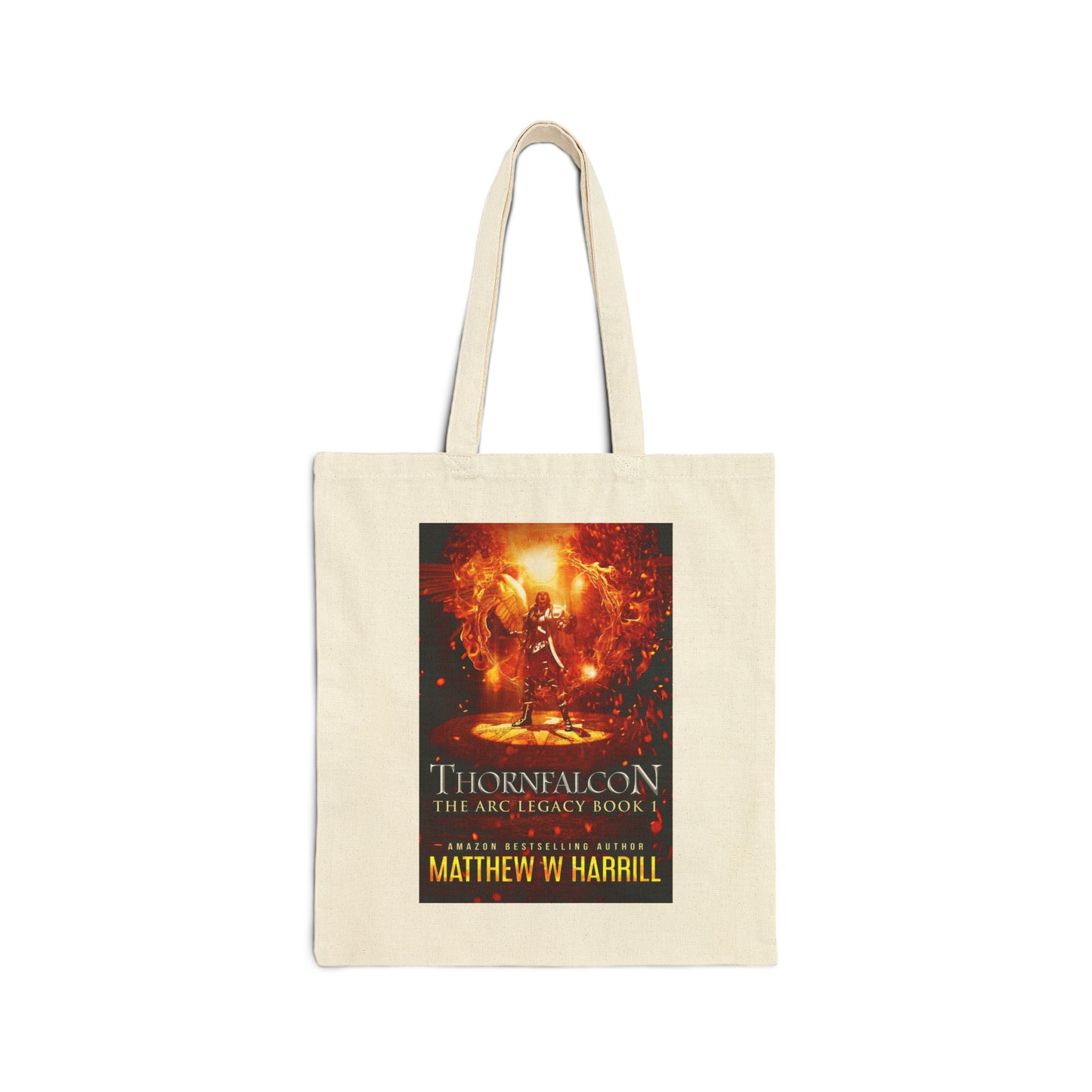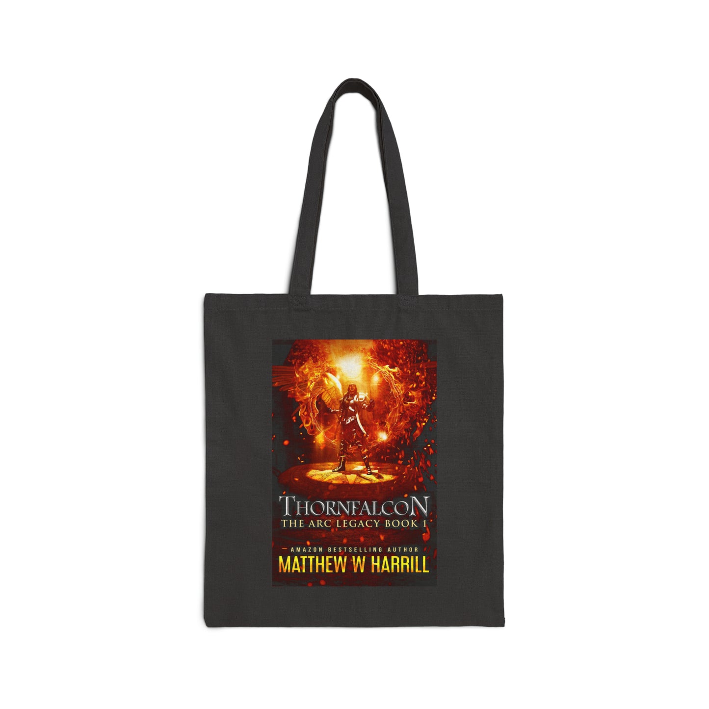This 100% cotton bag comes in one size – 15" x 16"– perfect for everyday wear. The canvas material is durable and the bag features 20" handles, making it easy to carry even with a week's worth of shopping. The cover art in this tote bag is from Matthew W. Harrill's book, Thornfalcon.