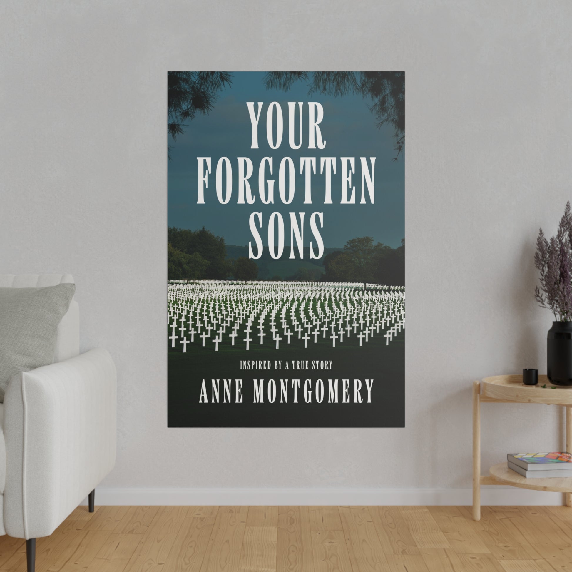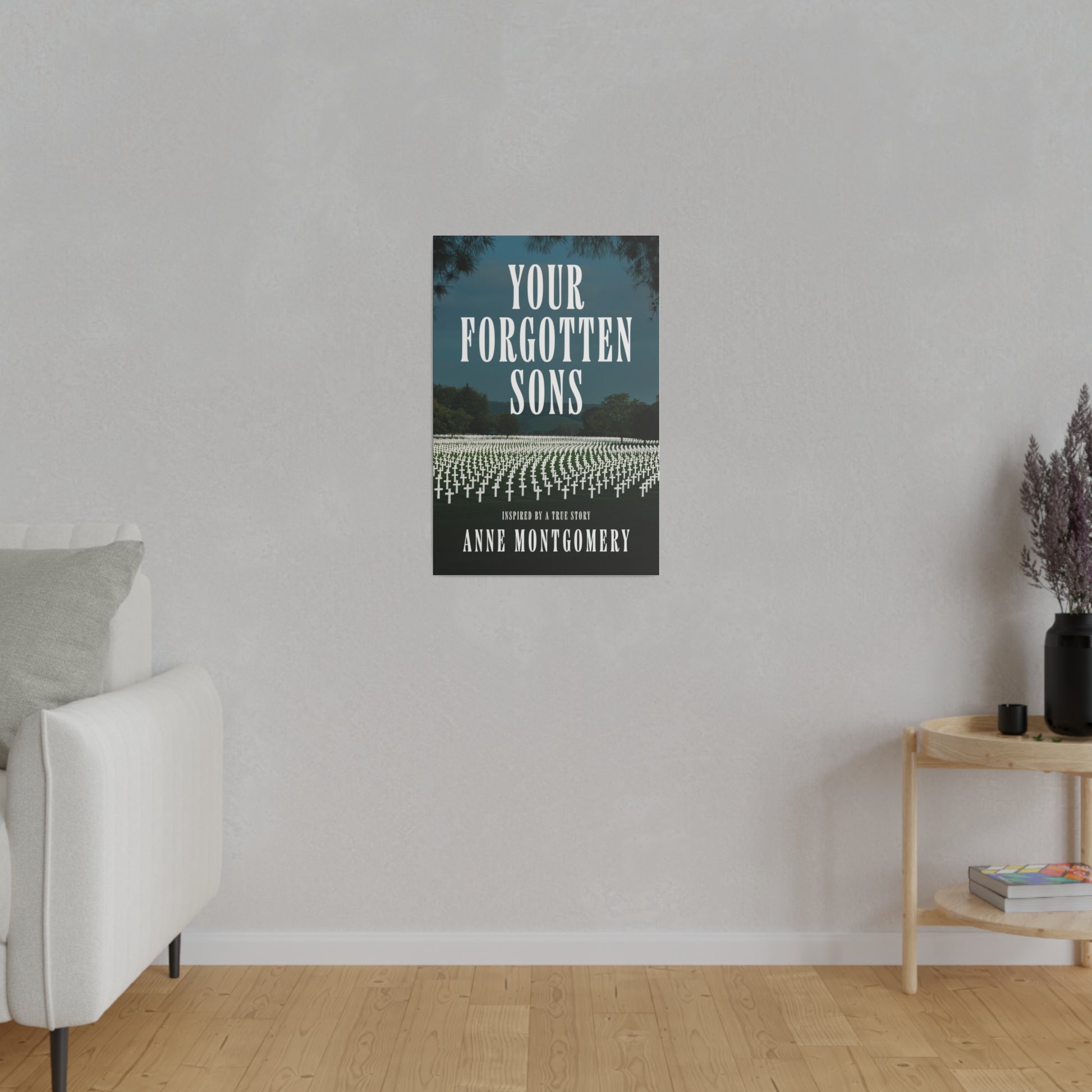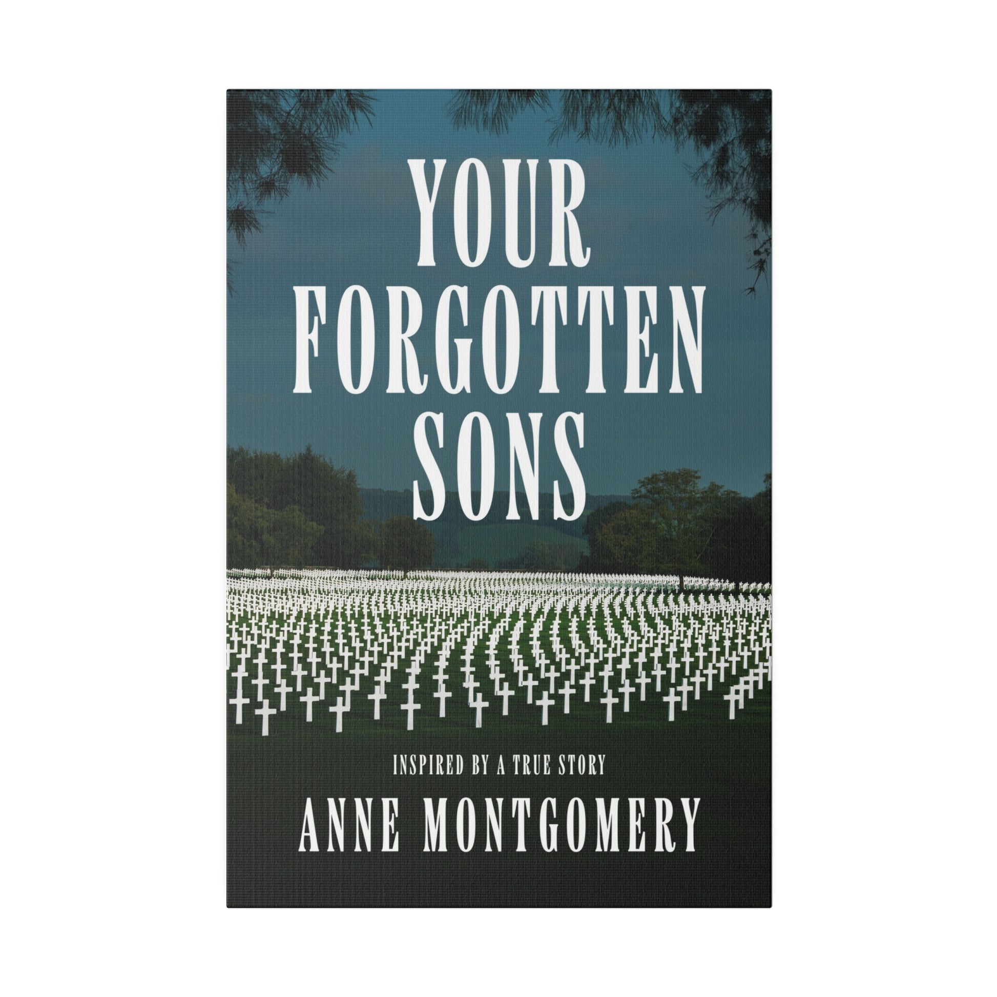 This matte canvas comes with back hanging already included for convenient placement. The frame is made with profile radial pine that is ethically sourced from renewable forests. The cover art in this canvas is from Anne Montgomery's book, Your Forgotten Sons.